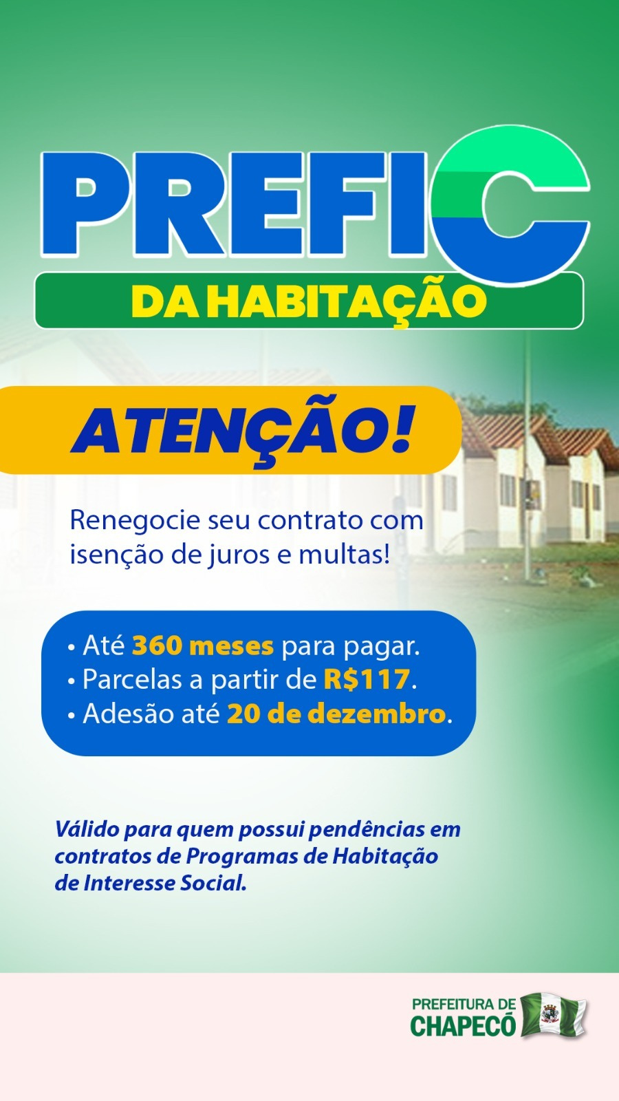 A prefeitura de Chapecó, por intermédio da Diretoria de Habitação e Regularização Fundiária, abriu novo prazo para o Prefic da Habitação. O propósito é oferecer isenção de juros e multas para contribuintes que possuem algum tipo de pendência em contratos de Programas de Habitação de Interesse Social do município. A adesão encerra no dia 20 de dezembro.
