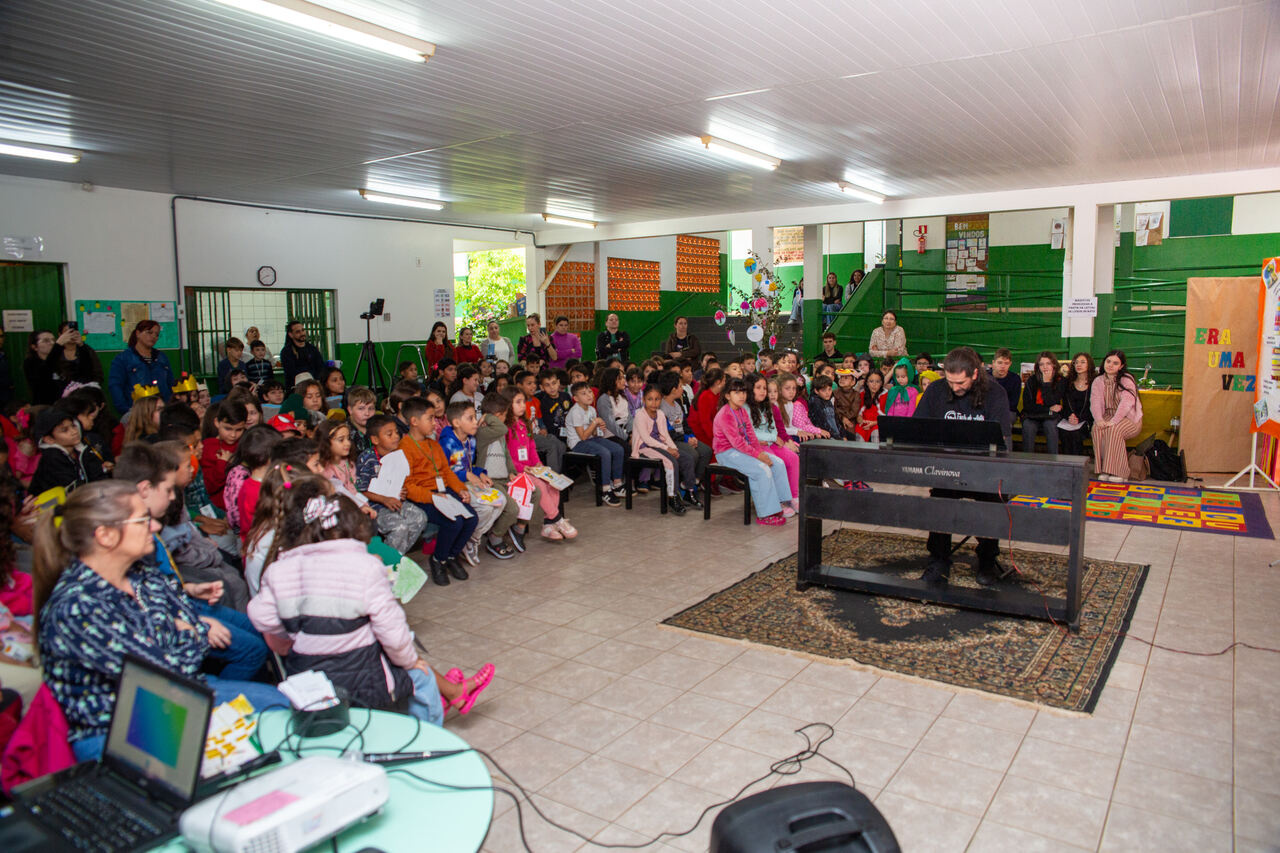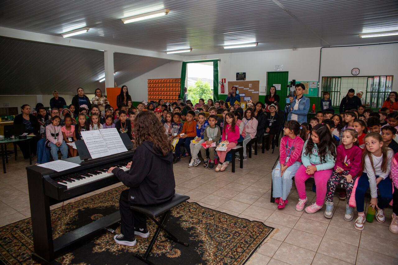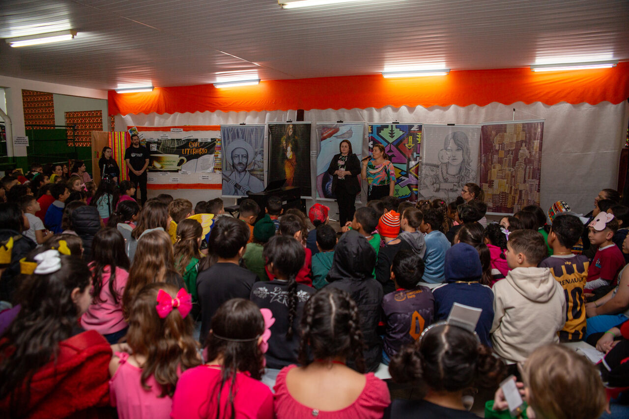 A EBM Florestan Fernandes promoveu nesta terça-feira (30/9) seu 3º Café Literário, evento marcado pela valorização da leitura, da poesia e do teatro. O momento, que envolveu alunos do 1º ao 9º ano, contou também com a participação especial dos estudantes da Escola de Artes de Chapecó, que encantaram o público com apresentações musicais ao piano.