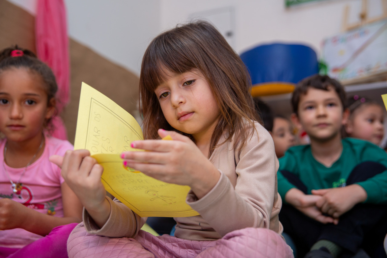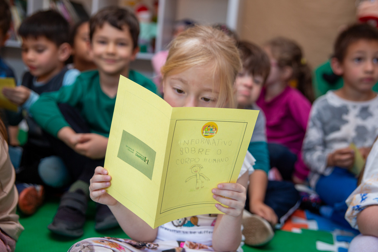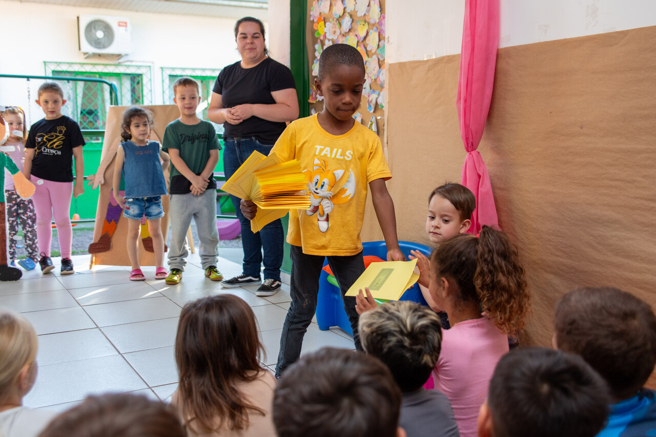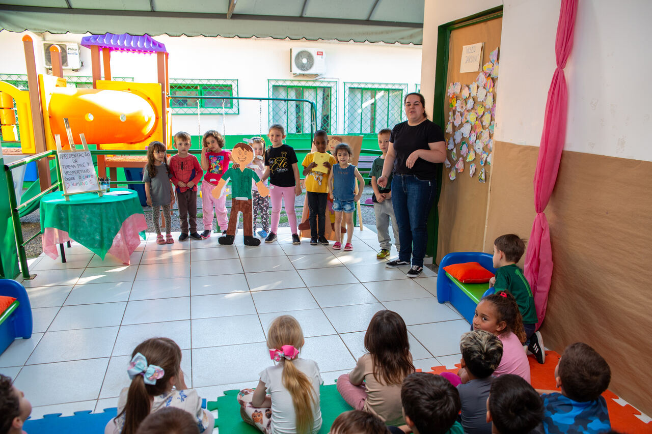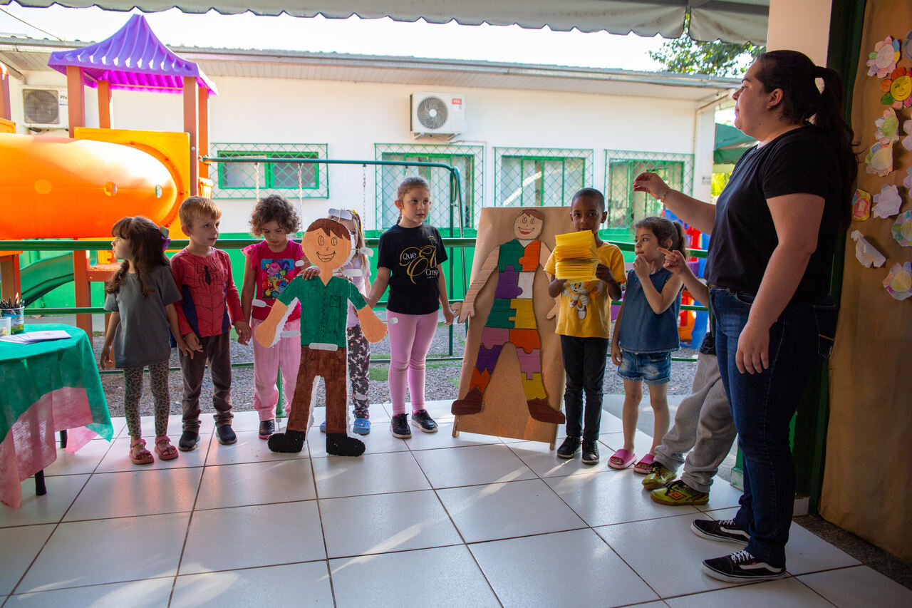 Além das atividades em sala de aula, o projeto também foi apresentado pelas crianças a outras turmas da instituição, promovendo um momento de troca de saberes e interação entre os colegas. Na apresentação, as crianças explicaram o que aprenderam sobre o corpo humano e entregaram um informativo sobre cuidados, produzido por elas mesmas, para que os outros alunos pudessem levar para casa e compartilhar com suas famílias, conclui a professora Karine.