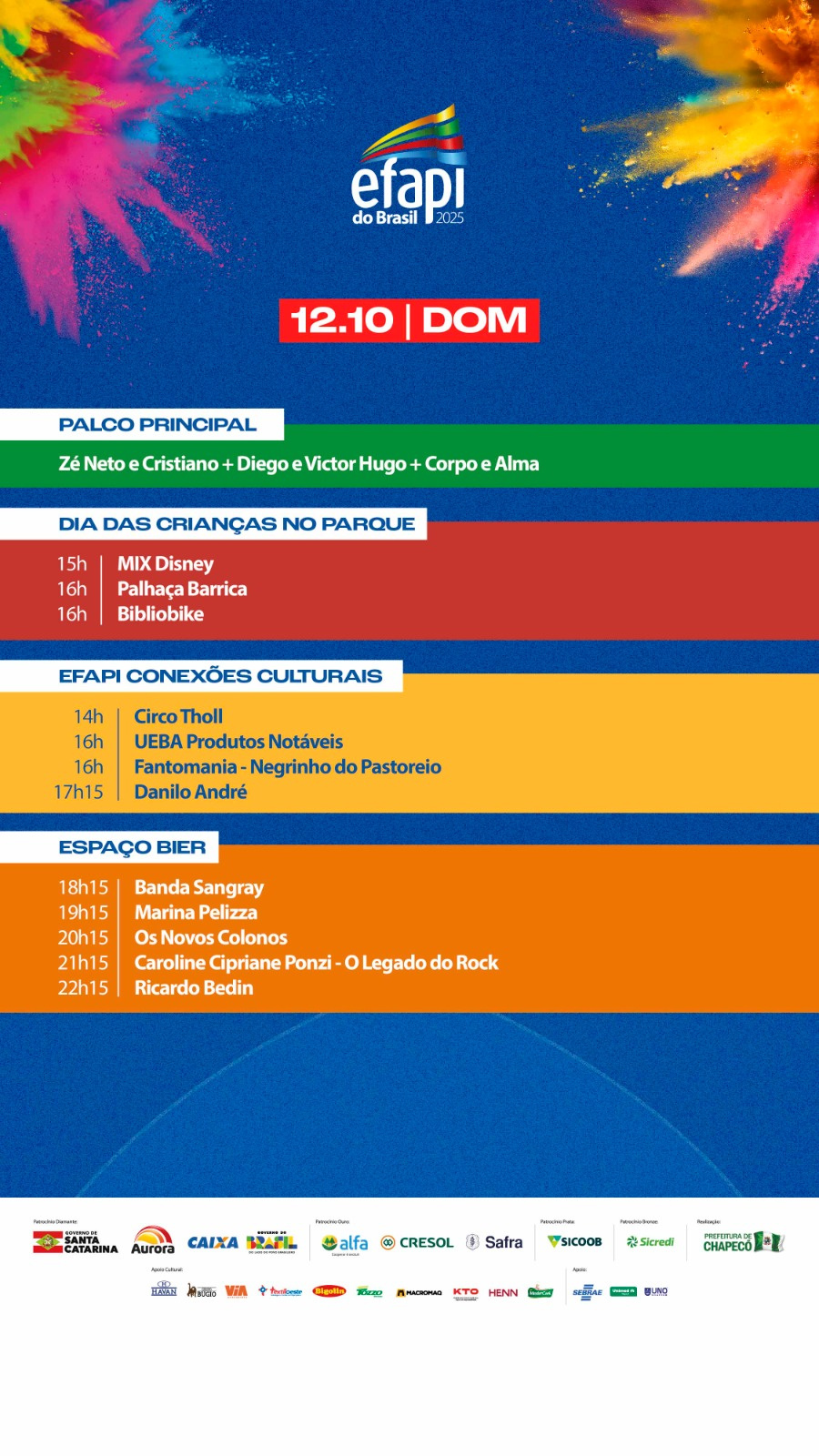 O primeiro domingo (12) da Efapi do Brasil está repleto de atrações para comemorar o Dia das Crianças. Os pavilhões para visitação abrem às 10h e seguem até às 22h. O parque Dr. Valmor Ernesto Lunardi receberá nos 10 dias de feira, 625 expositores vindos de todo o Brasil, para apresentar e divulgar produtos, serviços e soluções que melhoram o dia a dia das famílias e empresários. A expectativa do público é que 500 mil visitantes passem por ele nos 10 dias do evento.