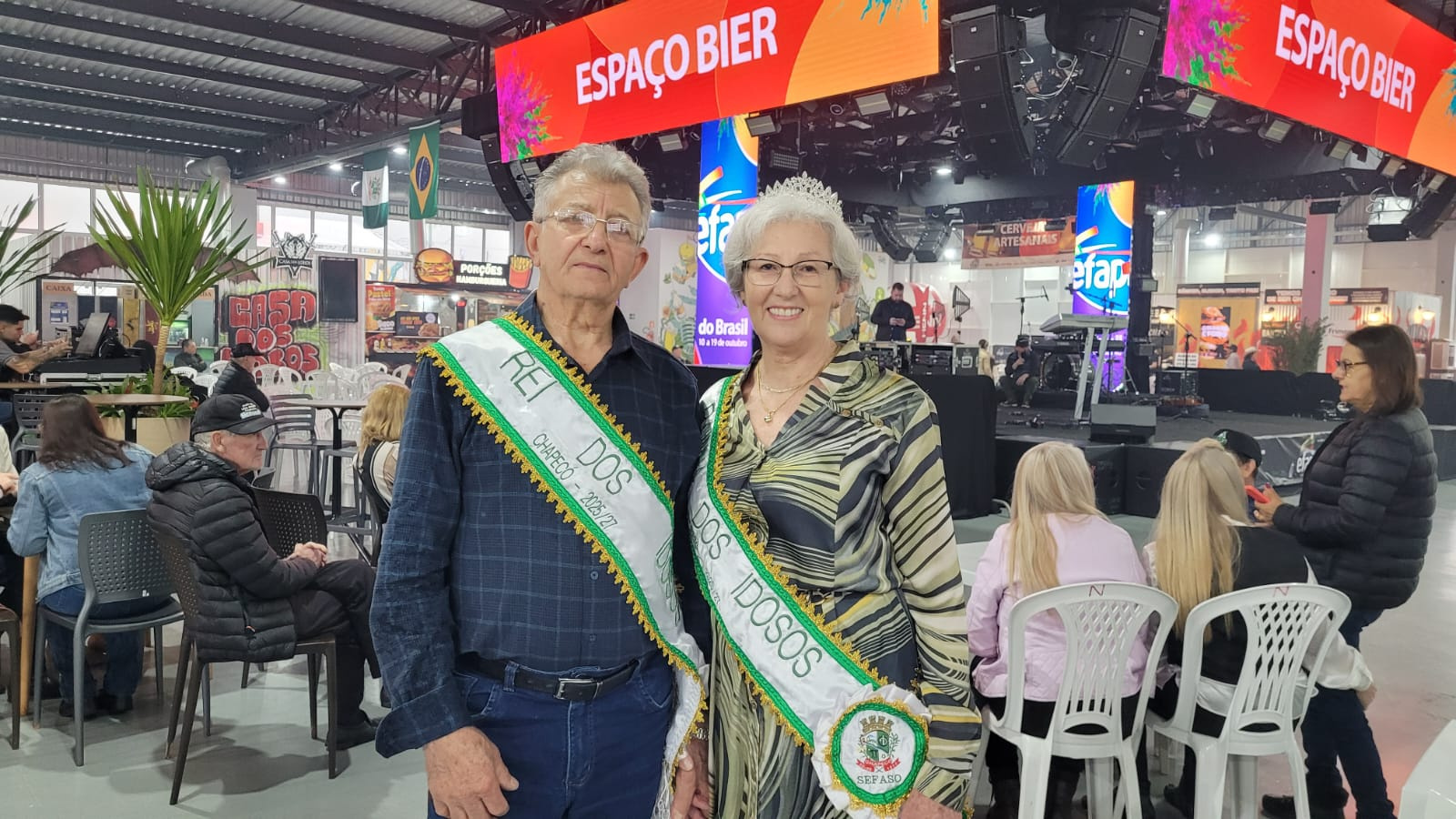 Entre os destaques do evento estavam os reis dos idosos de Chapecó, Inês e Jair Bonati, moradores do bairro Presidente Médici. Representando todos os grupos da cidade, o casal celebrou com orgulho o momento. Nos sentimos lisonjeados pelo cargo que nos foi concedido. Fomos escolhidos pelos 65 grupos de idosos, e é uma grande satisfação representá-los, contou Jair.