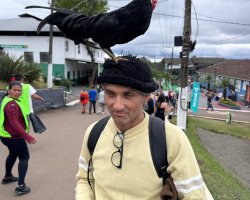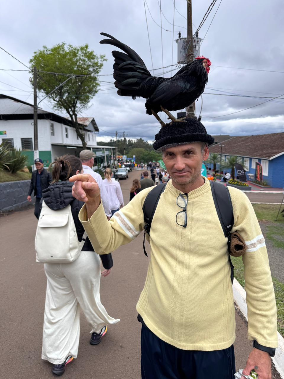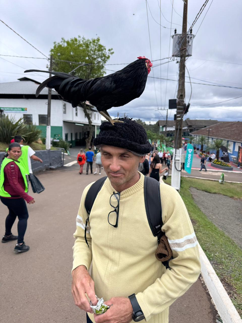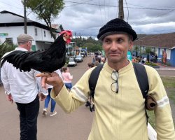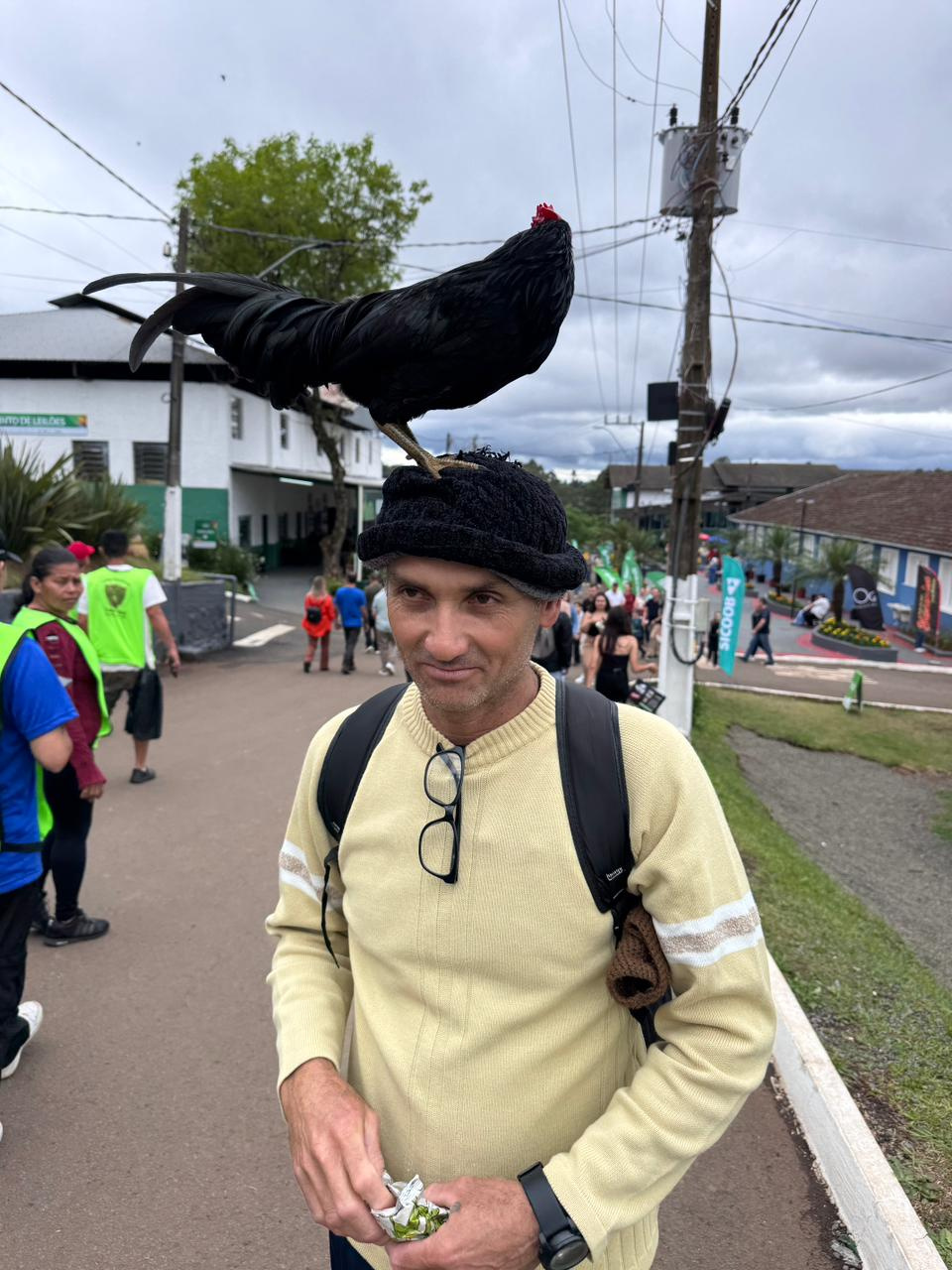 Quem passou pelo Parque Dr. Valmor Ernesto Lunardi, na manhã deste sábado (18), encontrou um visitante inusitado: o galo Solito, companheiro do venezuelano Manuel Laguna, morador do bairro Santo Antônio, em Chapecó. Manuel vive na Capital do Oeste há três anos e trabalha com práticas alternativas voltadas ao cuidado da saúde.