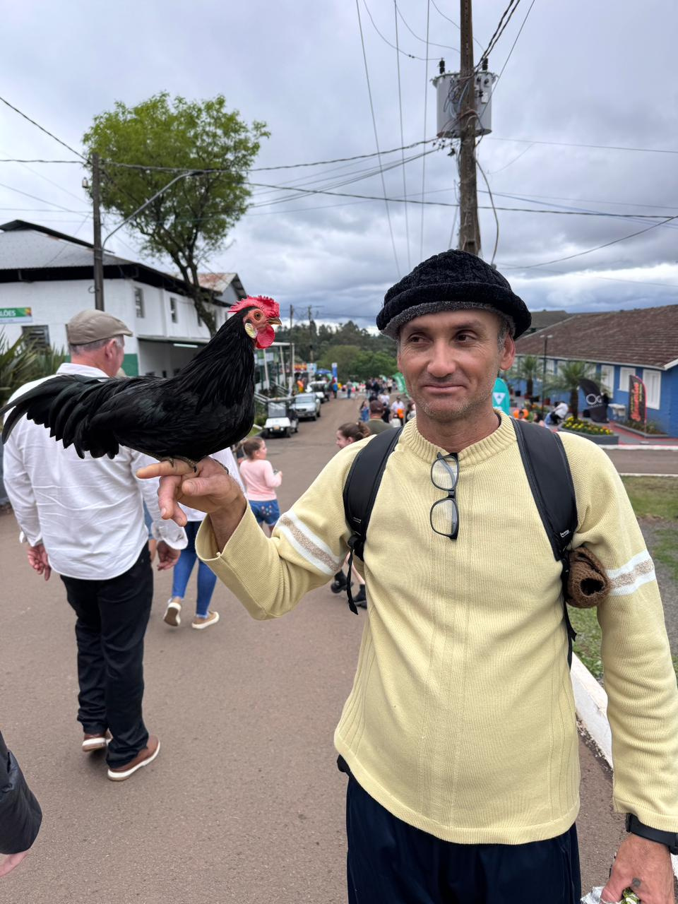 Ele aproveitou a manhã de sábado para visitar a Efapi do Brasil e conhecer as novidades apresentadas pelos expositores em diversas áreas. A feira está muito bacana e organizada, destaca Manuel. O que também chamou a atenção dos visitantes foi o próprio galo Solito. Segundo Laguna, ele tem oito meses e é tratado como um pet. Ele come ração de aves e galinhas, tem o lugar dele para dormir, mas anda direto comigo no banco, na lotérica, no supermercado, explica.