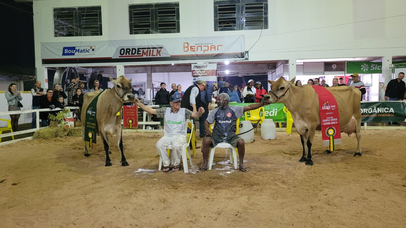 Essas duas vacas foram campeãs do torneio leiteiro. Uma delas foi terceira colocada de categoria e já havia sido grande campeã em Pinhalzinho, sendo reconhecida como a melhor vaca jovem do estado. A outra, de cinco anos, foi reservada nesta exposição, contou Juliano.