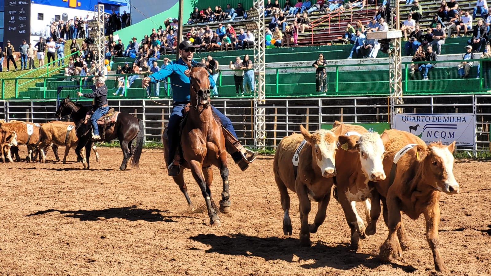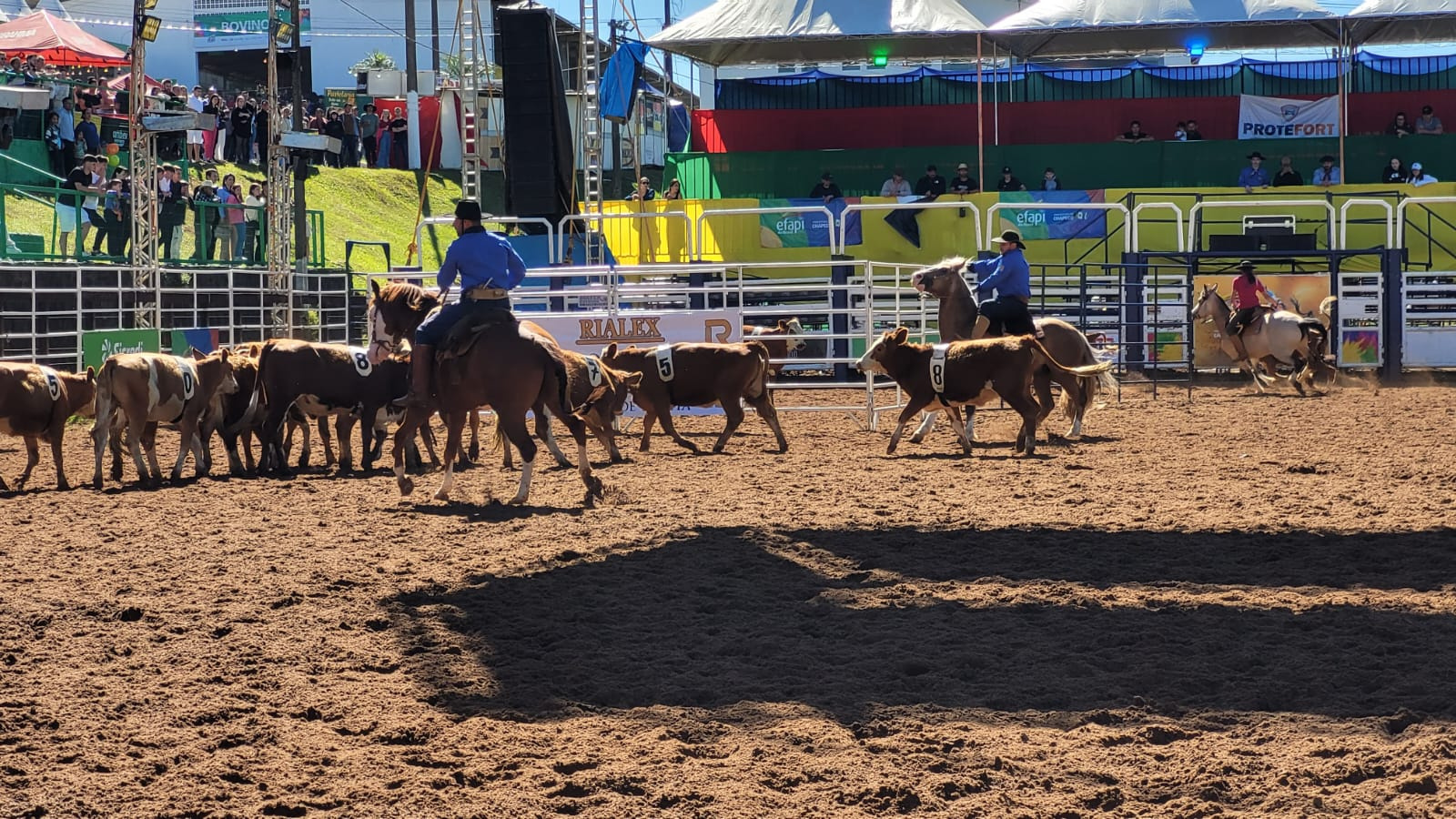 A adrenalina tomou conta da arena do rodeio neste domingo (19), durante a tarde do último dia da feira, com a estreia da prova de Team Penning na Efapi do Brasil. A modalidade, inédita na história do evento, reuniu 16 trios que demonstraram habilidade, sintonia e rapidez em uma disputa marcada pela emoção do público e pela técnica dos competidores.