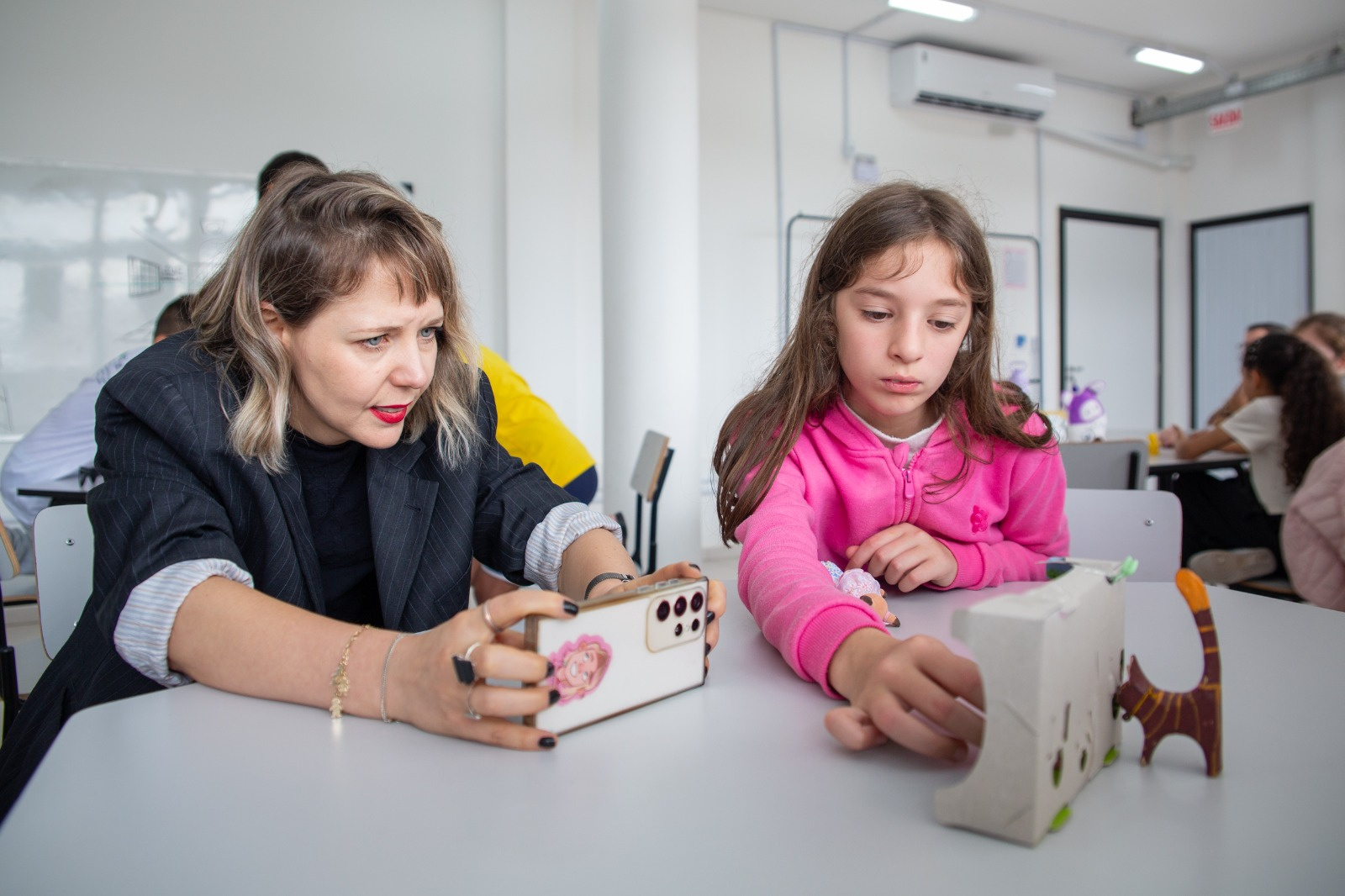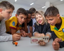 Ao aplicar essa técnica, as crianças não apenas aprendem sobre o processo de animação, mas também se tornam autoras de suas próprias narrativas, desenvolvendo habilidades importantes, como a criatividade e a coordenação motora fina. Estamos produzindo mini curta-metragens. Os estudantes constroem o roteiro e fazem a captura das fotos com o aplicativo de stop motion. Nesse processo, a criatividade aparece na criação da narrativa, na elaboração do cenário e dos movimentos, e a coordenação motora fina é estimulada à medida que manipulam os bonecos e percebem o movimento acontecer, explicou Aryana.