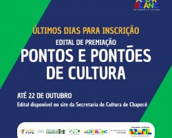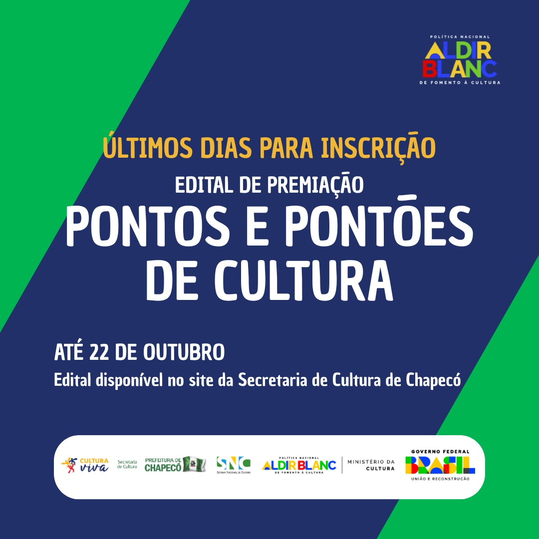 A prefeitura de Chapecó, por meio da secretaria de Cultura, informa que termina na quarta-feira o prazo para inscrição de entidades, coletivos culturais e Pontos de Cultura já credenciados, Pontos e Pontões de Cultura de Chapecó.