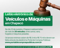 Está encerrando o prazo para a fase de ofertas do leilão de veículos e bens móveis inservíveis de propriedade do município de Chapecó. Os lances ainda podem ser apresentados até o período da manhã da próxima quinta-feira (23), data em que serão ofertas mais de 20 veículos.