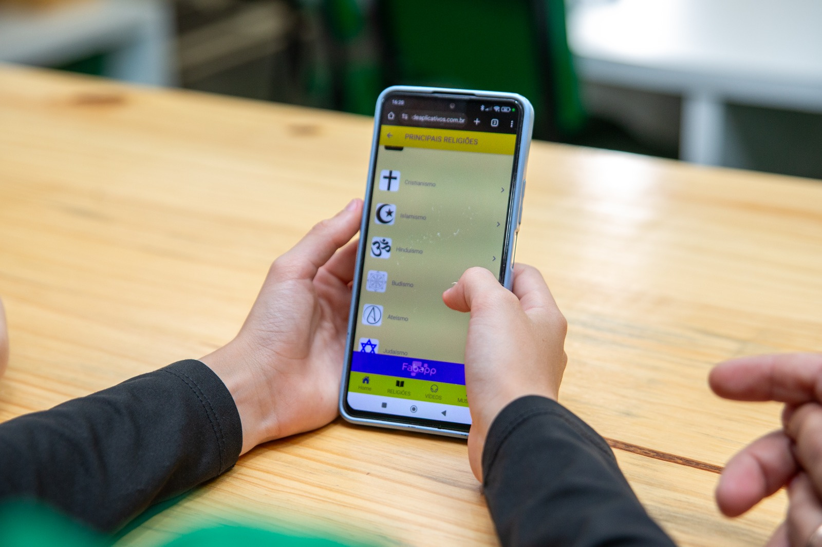O estudante Matheus Henrique Rosa, do sétimo ano, comenta como foi a construção do aplicativo. Já sabíamos um pouco sobre o desenvolvimento de aplicativos graças ao curso CPDI, que fizemos na escola. Então, dividimos as tarefas entre nós. Cada um ficou responsável por uma parte. Incluímos informações sobre todas as religiões, suas tradições, os termos religiosos que utilizam, e discutimos temas como intolerância religiosa e os diferentes sistemas religiosos", explicou.