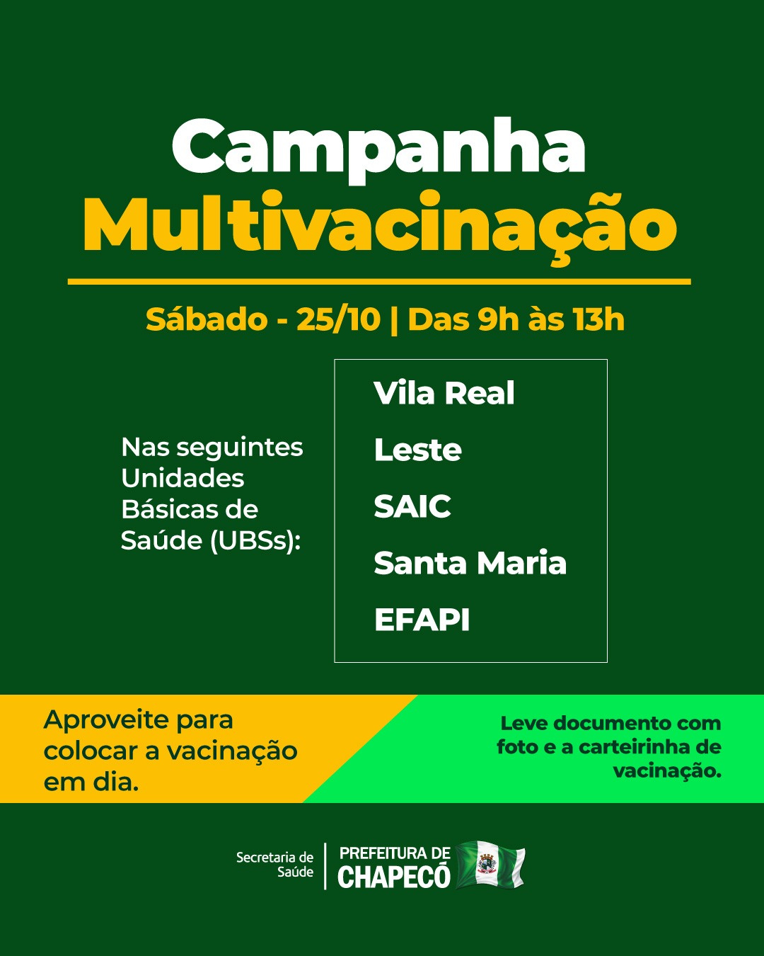 A prefeitura de Chapecó, por meio da Secretaria da Saúde, realiza neste sábado (25) o Dia D da Campanha Nacional de Multivacinação. Ela faz parte de uma campanha nacional, promovida pelo Ministério da Saúde, que vai até 31 de outubro. A maioria dos municípios fez o Dia D no sábado passado mas Chapecó optou por fazer neste final de semana devido à Efapi do Brasil.