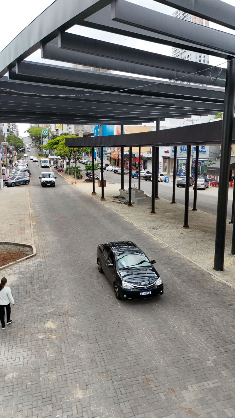 Os trabalhos iniciaram em abril de 2024, com a remoção dos postes e instalação da rede subterrânea de energia. Depois foram construídas as bases dos pilares e começaram a ser erguidas as estruturas metálicas, primeiro na quadra entre as avenidas Nereu Ramos e Getúlio Vares e, posteriormente, entre a Getúlio Vargas e a Fernando Machado, compreendendo uma área de 378 metros de comprimento.