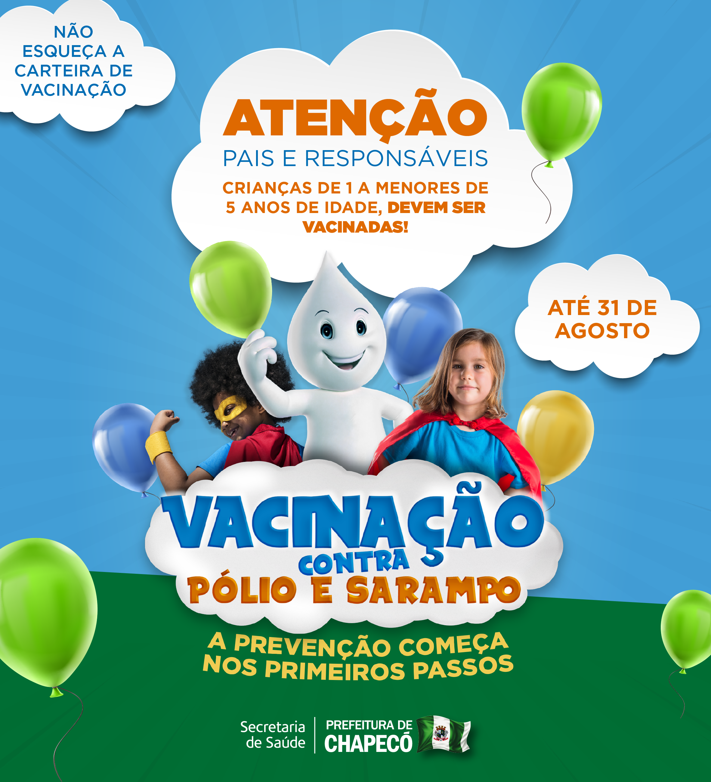 A Campanha Nacional de Vacinação contra a Poliomielite e o Sarampo segue até o dia 31 de agosto de 2018. O objetivo da campanha é vacinar contra a poliomielite e o sarampo as crianças de um a quatro anos, 11 meses e 29 dias de idade e a meta é atingir 95% dessas crianças, para evitar a manutenção ou formação de bolsões de não vacinados. Essa estratégia visa manter elevada a cobertura vacinal contra a poliomielite nos municípios, visando evitar a reintrodução do vírus da poliomielite, bem como o sarampo e a rubéola, para manter o estado de eliminação dessas doenças no país. Os pais e responsáveis são atores sociais importantes no processo de manutenção da eliminação dessas doenças e devem comparecer aos serviços de vacinação com as crianças, levando também a caderneta de vacinação para avaliação e registro.