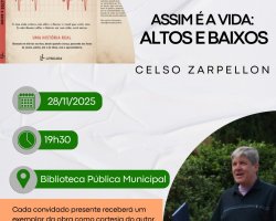 Na sexta-feira, dia 28 de novembro, às 19h30, a Biblioteca Pública Municipal Neiva Maria Andreatta Costella recebe o lançamento do livro Assim é a Vida: Altos e Baixos, de Celso Zarpellon, professor e engenheiro agrônomo.