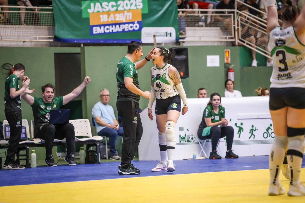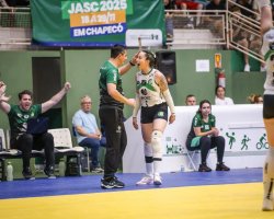 O voleibol feminino também está na semifinal. Nesta quinta-feira, vitória por 3 sets a 0 sobre Criciúma. Amanhã, pela semifinal, enfrentam Brusque às 19h, no Ginásio Ivo Silveira.