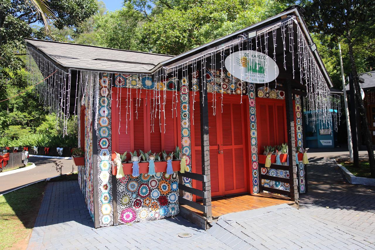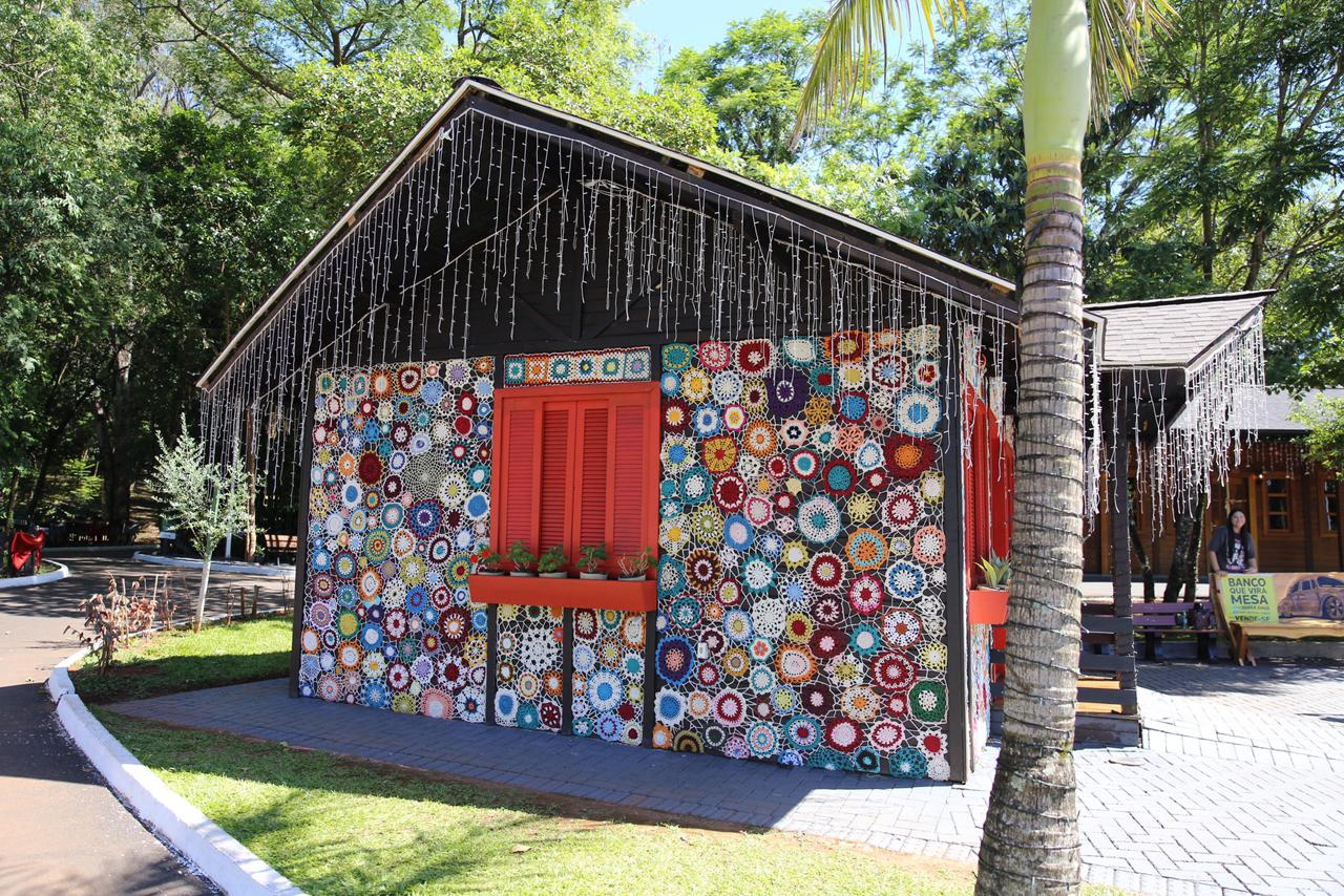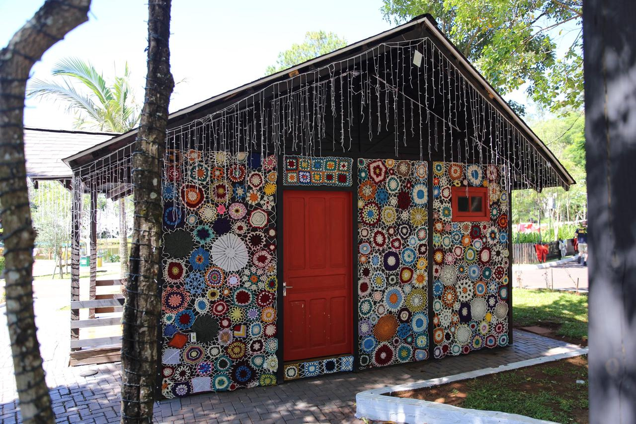 Uma casa decorada com 1,1 mil peças de crochê uma estrutura de asas com seis metros de largura, feitas em macramê, são algumas das novidades da decoração natalina do Ecoparque de Chapecó.