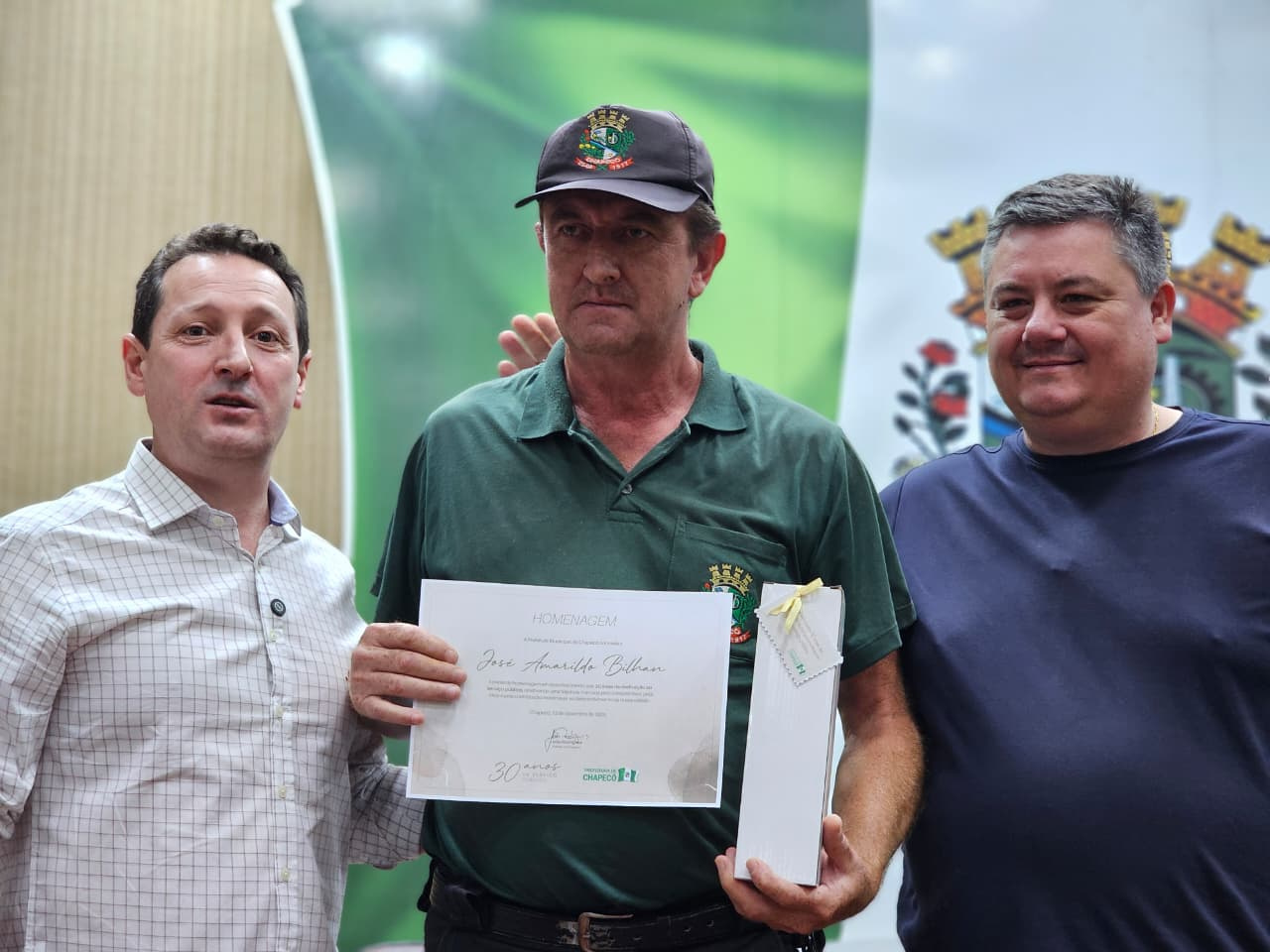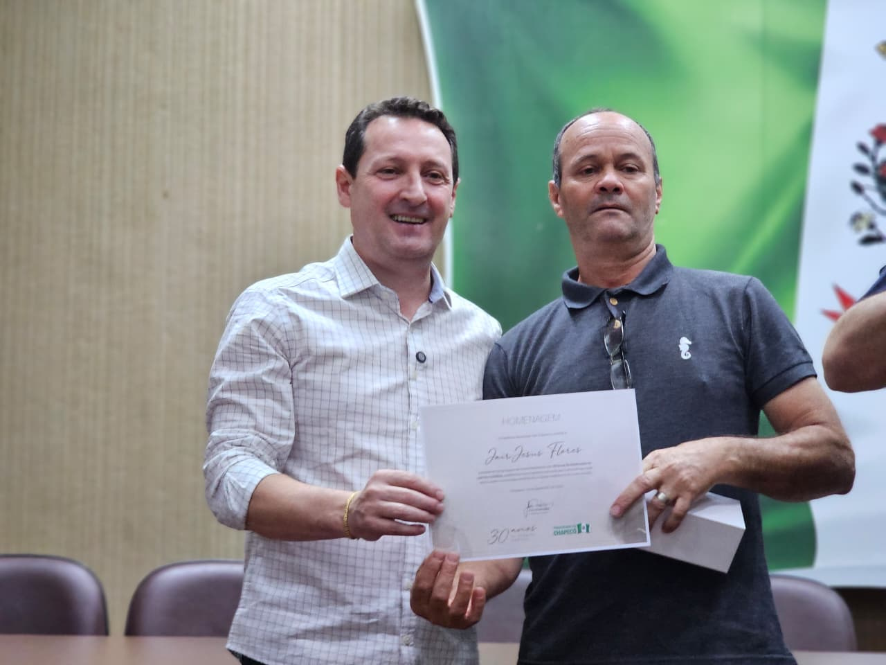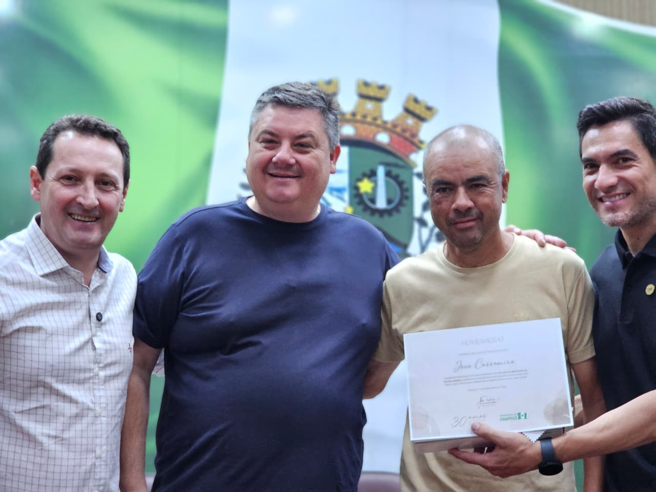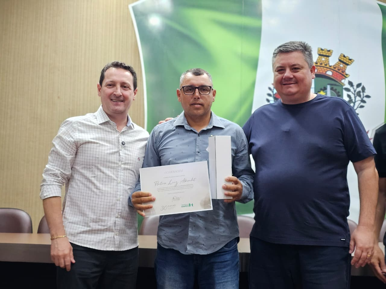 O presidente da Câmara de Vereadores, Claimar de Conto foi um dos homenageados e falou em nome dos colegas. Cada um aqui tem uma história de trabalho nesses 30 anos. Desde 1995 tivemos um período de transformação do nosso município, com quatro mandados do prefeito João Rodrigues. Tivemos seis Jogos Abertos, com a recente conquista de campeão geral. Saímos de 140 mil habitantes, para 282 mil habitantes. Éramos mil servidores, agora são sete mil. Cada um deu sua contribuição. Nós temos o dom de servir a população de Chapecó, disse Claimar.