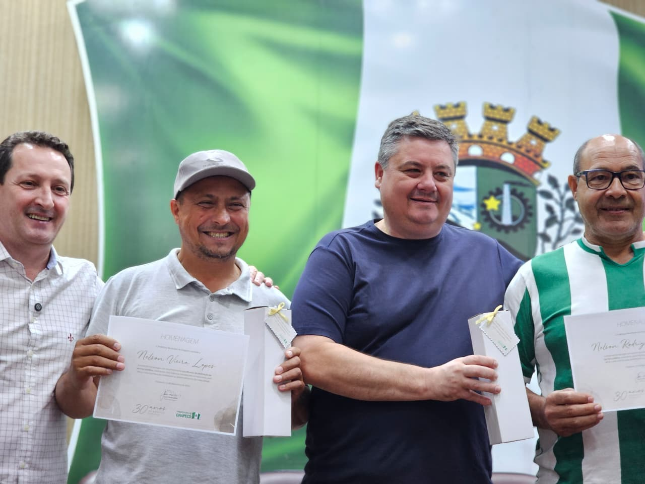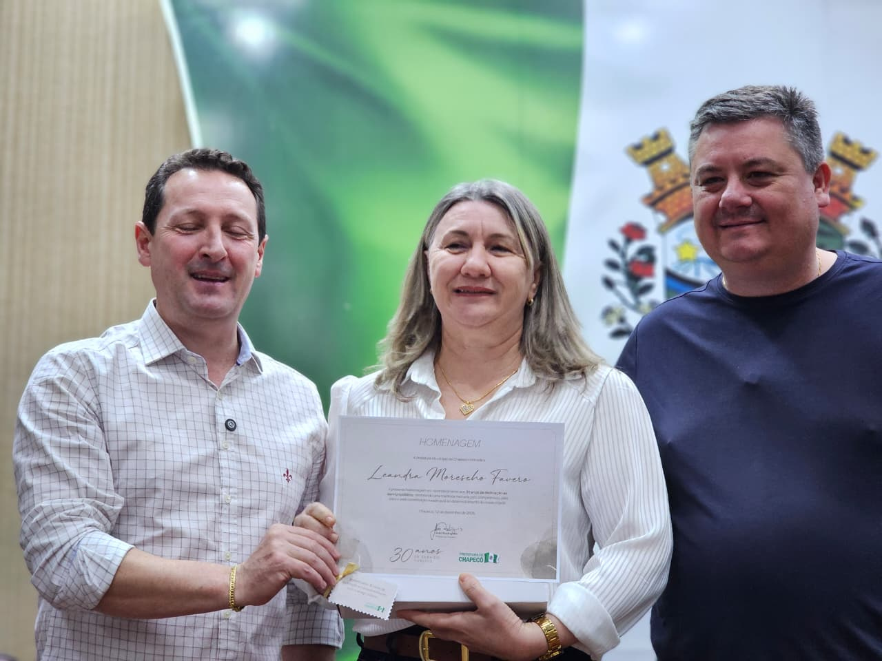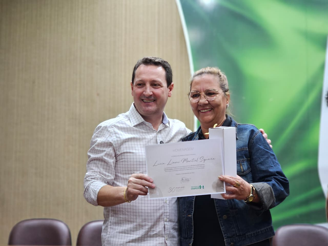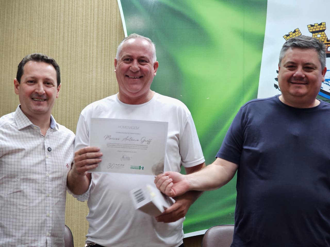 O presidente da Câmara de Vereadores, Claimar de Conto foi um dos homenageados e falou em nome dos colegas. Cada um aqui tem uma história de trabalho nesses 30 anos. Desde 1995 tivemos um período de transformação do nosso município, com quatro mandados do prefeito João Rodrigues. Tivemos seis Jogos Abertos, com a recente conquista de campeão geral. Saímos de 140 mil habitantes, para 282 mil habitantes. Éramos mil servidores, agora são sete mil. Cada um deu sua contribuição. Nós temos o dom de servir a população de Chapecó, disse Claimar.