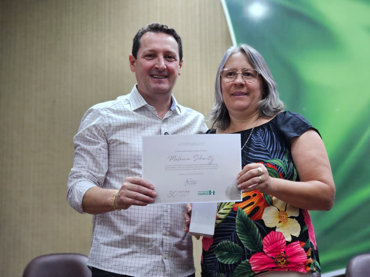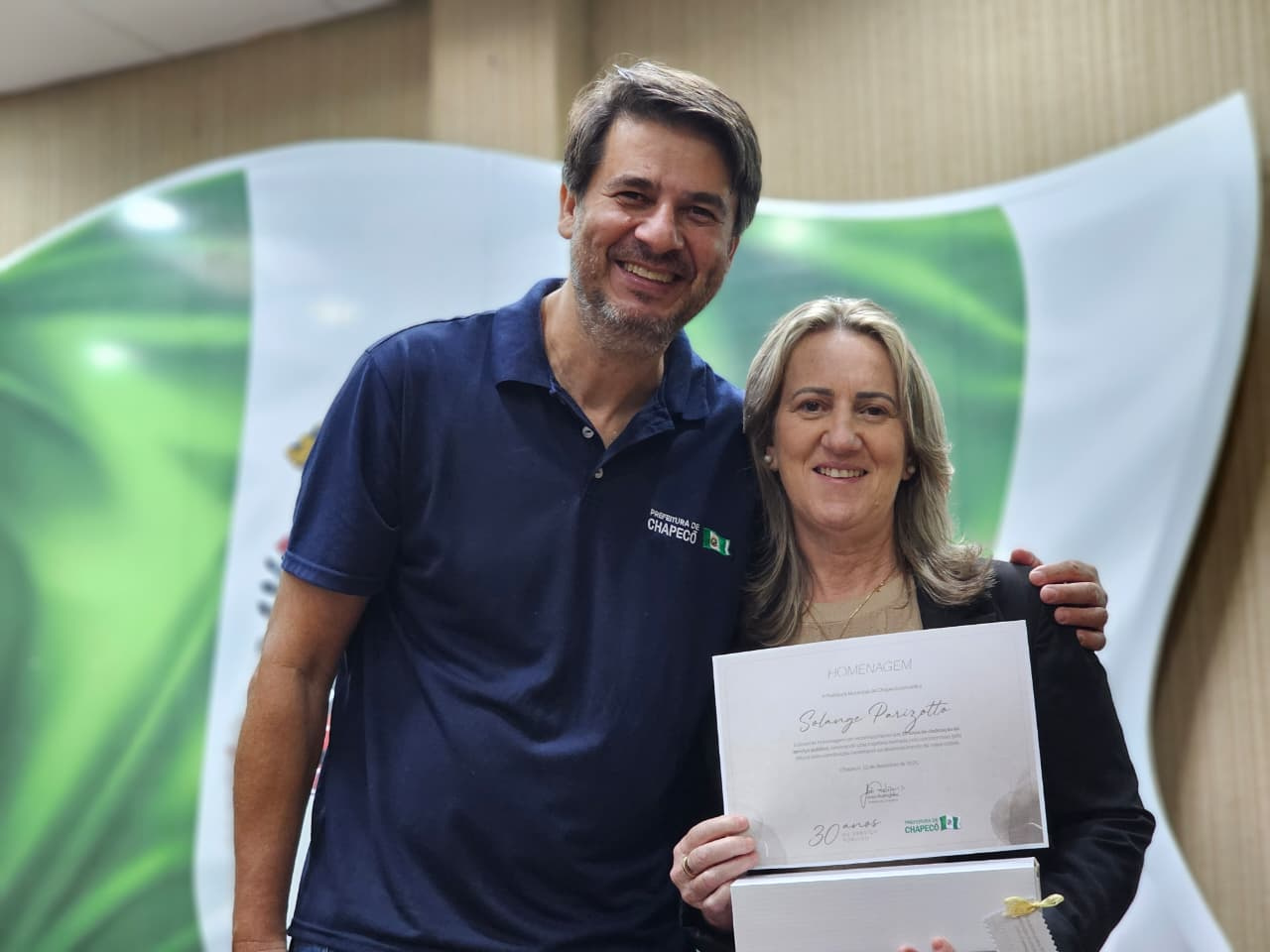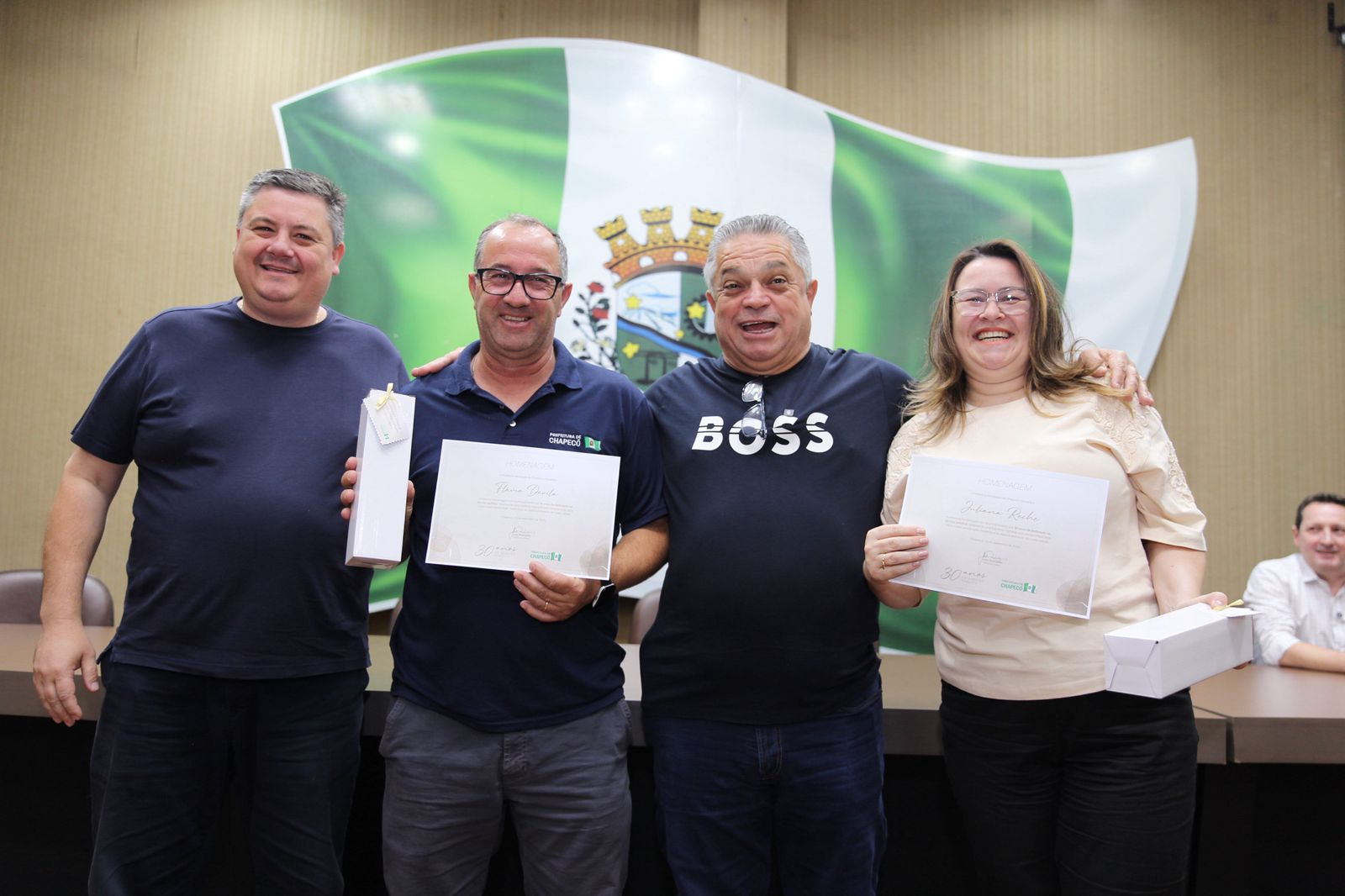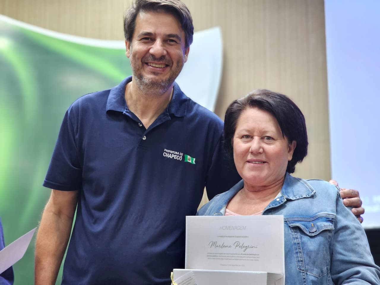 O presidente da Câmara de Vereadores, Claimar de Conto foi um dos homenageados e falou em nome dos colegas. Cada um aqui tem uma história de trabalho nesses 30 anos. Desde 1995 tivemos um período de transformação do nosso município, com quatro mandados do prefeito João Rodrigues. Tivemos seis Jogos Abertos, com a recente conquista de campeão geral. Saímos de 140 mil habitantes, para 282 mil habitantes. Éramos mil servidores, agora são sete mil. Cada um deu sua contribuição. Nós temos o dom de servir a população de Chapecó, disse Claimar.