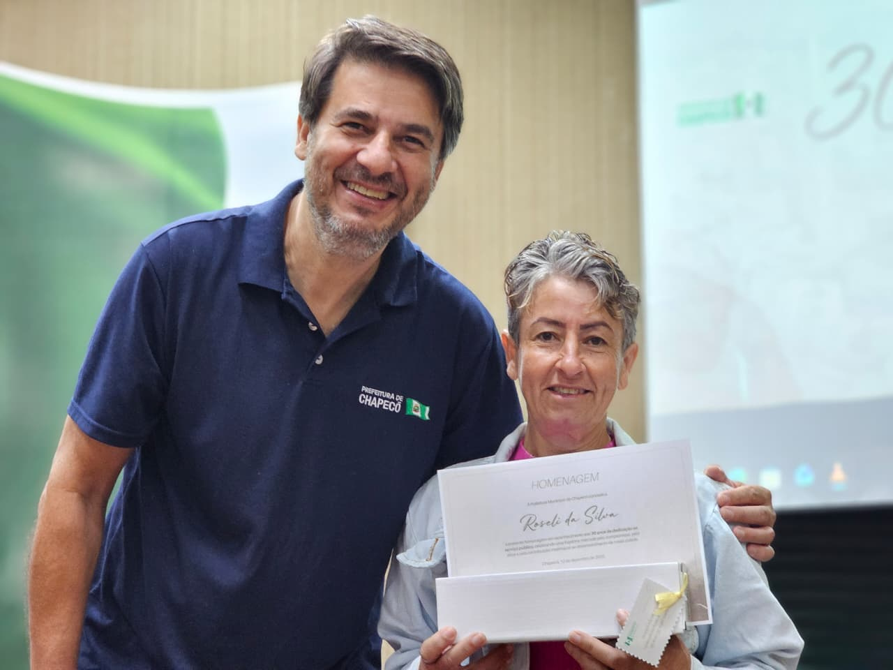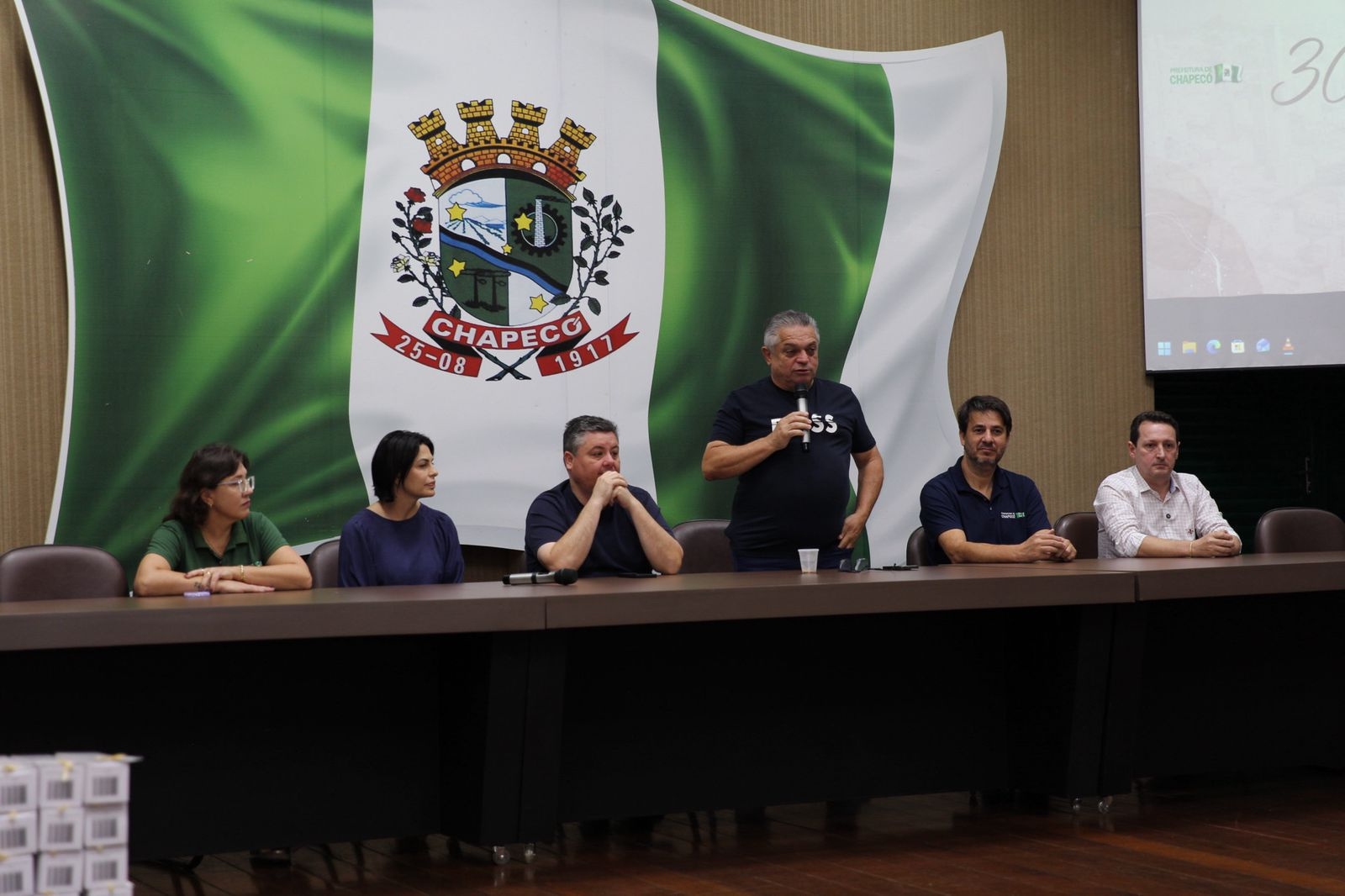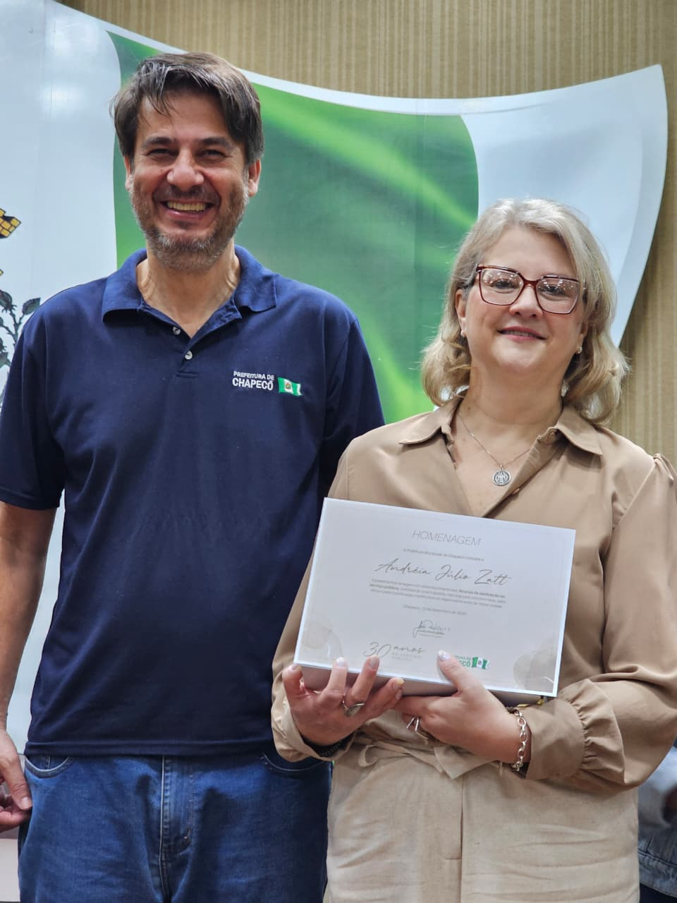 A Prefeitura de Chapecó, por meio da secretaria de Administração, realizou na manhã desta sexta-feira (12) o Jubilados 2025, uma homenagem aos servidores municipais com 30 anos de serviço público. Foram 92 pessoas que participaram do ato no auditório da Prefeitura e receberam um certificado e uma garrafa térmica de água.
