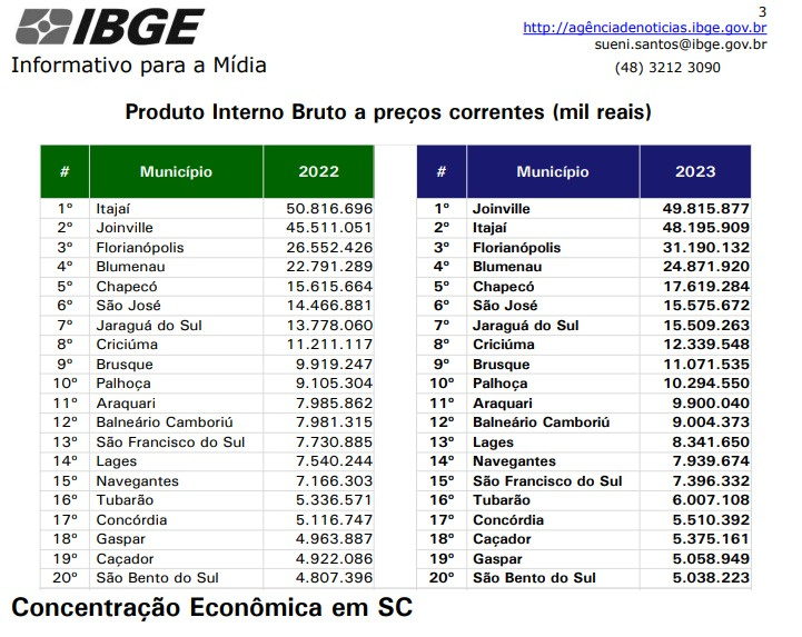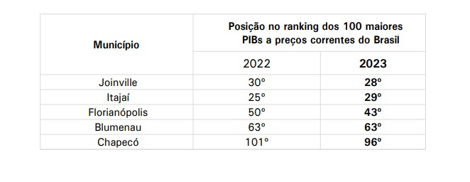 Chapecó ingressou na lista dos cem maiores PIBs do país, segundo dados divulgados nesta sexta-feira (19), pelo Instituto Brasileiro de Geografia e Estatística (IBGE). Os dados são relativos a 2023. Neste ano Produto Interno Bruto da maior cidade do Oeste chegou a R$17,6 bilhões, ficando na posição 96 no país e quinto em Santa Catarina, atrás apenas de Joinville, Itajaí, Florianópolis e Blumenau, que são cidades mais populosas. Em 2022 Chapecó estava na posição 101, com PIB de R$15,6 bilhões. Houve um aumento de R$2 bilhões em apenas um ano, num crescimento de 12%.
