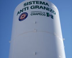 Chapecó é a primeira cidade da América Latina com proteção antigranizo em área urbana. O sistema, inaugurado nesta segunda-feira (2), foi instalado na rua Quilombo, no bairro Efapi, vai proteger uma área de 80 hectares, equivalente a 112 campos de futebol. Ele é composto por uma torre com cinco metros de altura (8m se contar a estrutura pra abafar o som) e equipamentos que emitem ondas sonoras para a estratosfera, numa altura de cerca de 15 mil metros, que dissolve a formação de granizo nas nuvens.