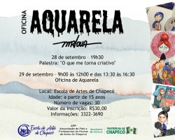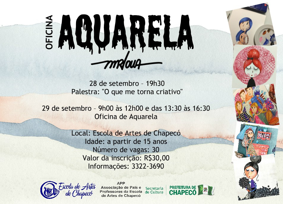 Estão abertas as inscrições para a oficina de Aquarela na Escola de Artes de Chapecó, com a artista Marlowa Pompermayer. As inscrições podem ser feitas até a terça-feira, 25 de setembro, na sede da Instituição, na Av. Nereu Ramos, 729D. O horário de atendimento é de segunda a quinta-feira, das 8h30 às 12h e das 13h30 às 18h30 e nas sextas-feiras até às 17h15.