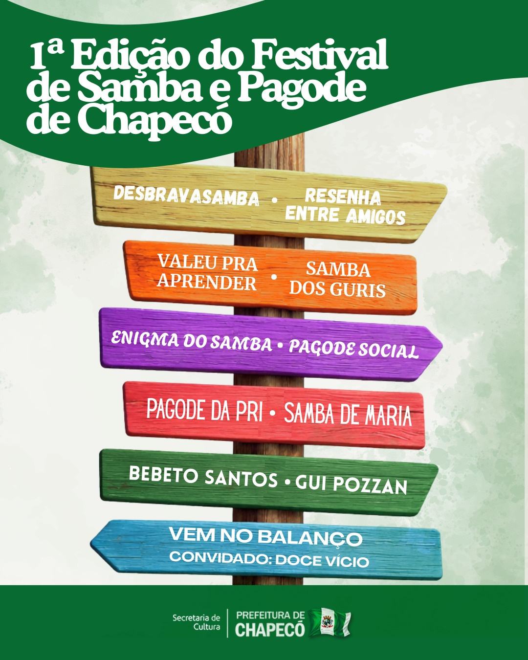 No sábado (14) acontecerá em Chapecó a 1ª Edição do Festival de Samba e Pagode. Um evento que vai reunir os grupos e artistas locais em uma tarde repleta de música boa, para unir a família, um evento com alegria e muita energia. A atividade é organizada pela Prefeitura de Chapecó, por meio da Secretaria de Cultura. Ela será das 13h às 21h no Calçadão Boulevard Rodolfo Mauricio Hirsch.