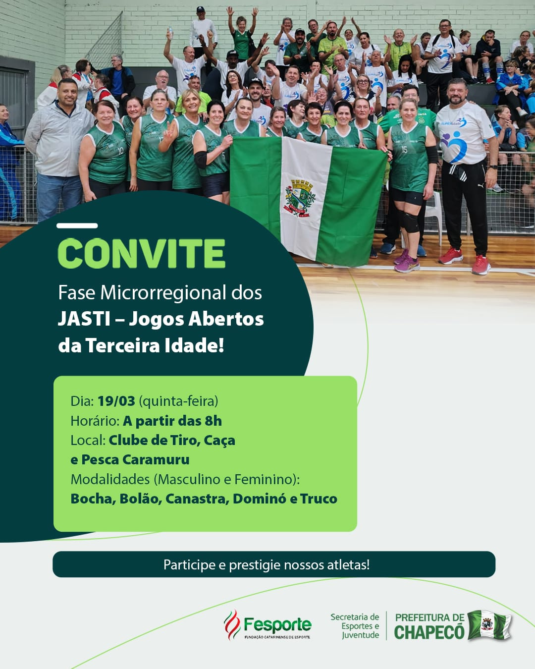 A cidade de Chapecó recebe, nesta quinta-feira (19), a etapa microrregional dos Jogos Abertos da Terceira Idade (JASTI). Sete municípios participam das disputas em busca de vaga para a etapa estadual. A abertura do evento será às 8h, no Clube de Tiro, Caça e Pesca Caramuru.