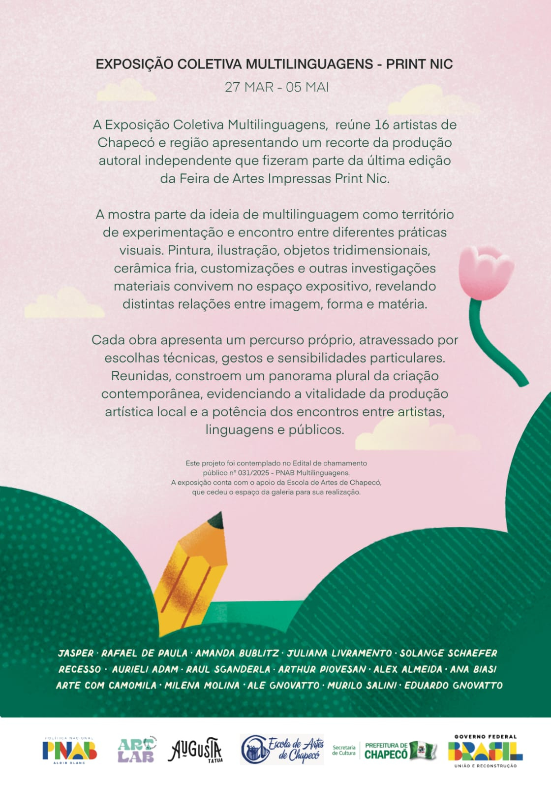 Os trabalhos exibidos integram a seleção da última edição da Feira de Artes Impressas Print Nic, realizada na Augusta Tatua, e chegam agora ao espaço expositivo da Escola de Artes em uma configuração ampliada e plural. A exposição parte do conceito de multilinguagem como território de experimentação e encontro entre diferentes práticas visuais: pintura, ilustração, objetos tridimensionais, cerâmica fria, customizações e outras investigações materiais dividem o mesmo espaço, revelando distintas relações entre imagem, forma e matéria.