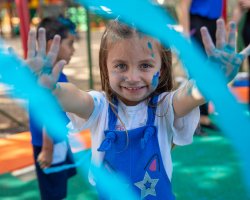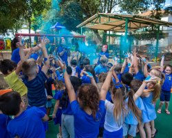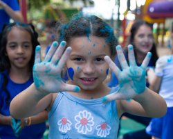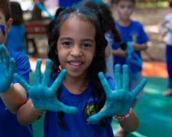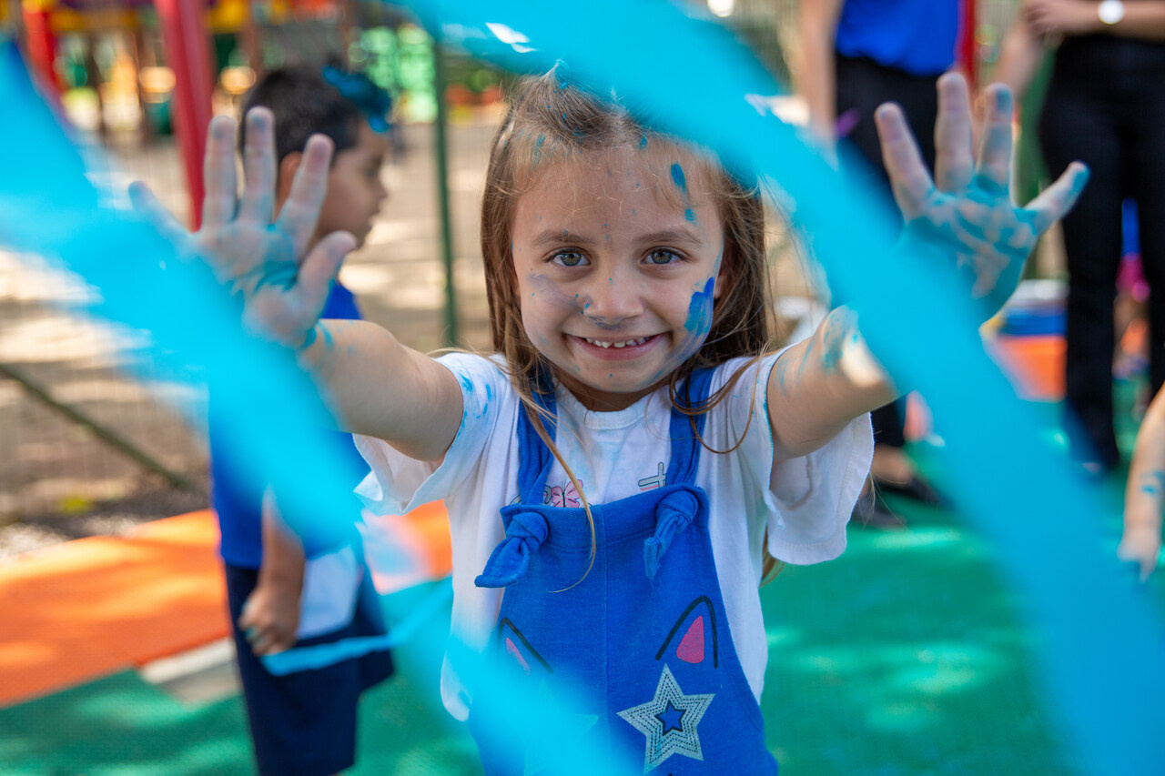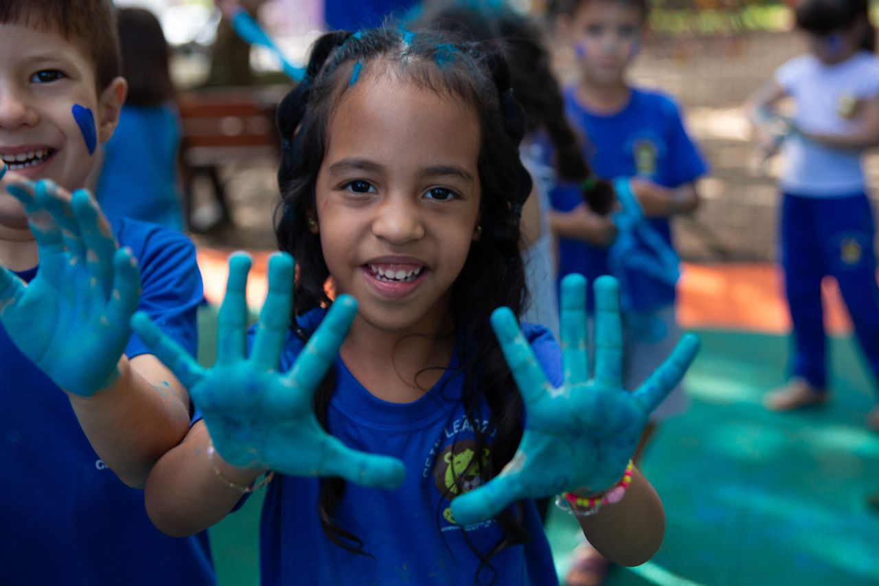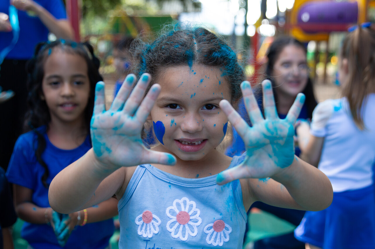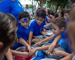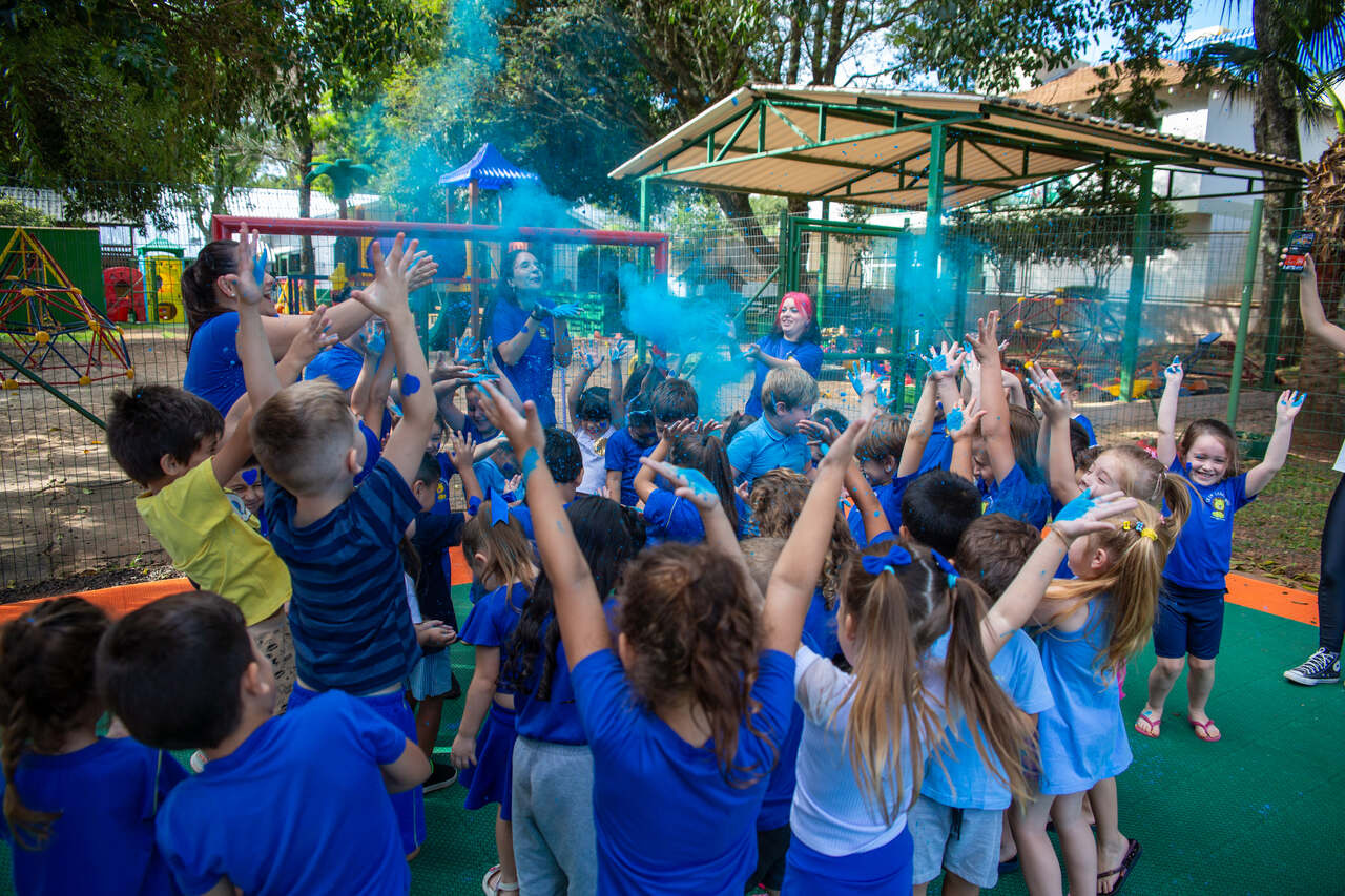 Após essa experiência, as crianças participaram de um momento musical, ouvindo uma canção que abordava inclusão, acolhimento, amor e respeito. Para finalizar a ação, cada criança recebeu um pozinho azul e em um gesto coletivo, todos jogaram o pó para o alto, encerrando a vivência com um momento de celebração e empatia.