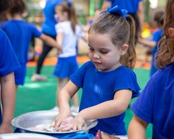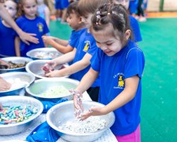 Na sequência, as crianças foram convidadas a participar de uma vivência com mesas sensoriais contendo diferentes elementos. As crianças puderam explorar, tocar e sentir as diversas sensações proporcionadas pelos materiais, refletindo sobre os colegas com autismo e a sensibilidade que alguns podem ter em relação a texturas, cores e estímulos sensoriais.