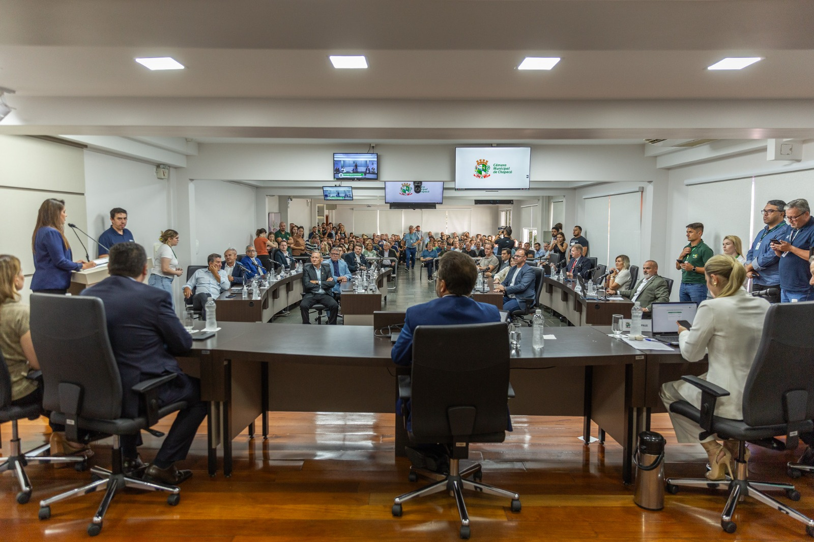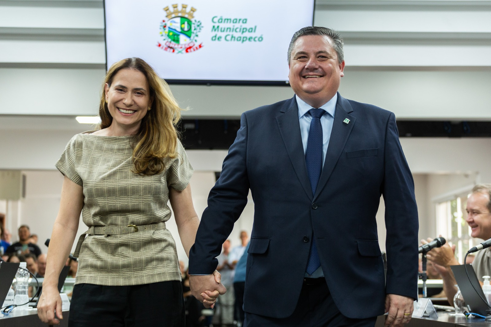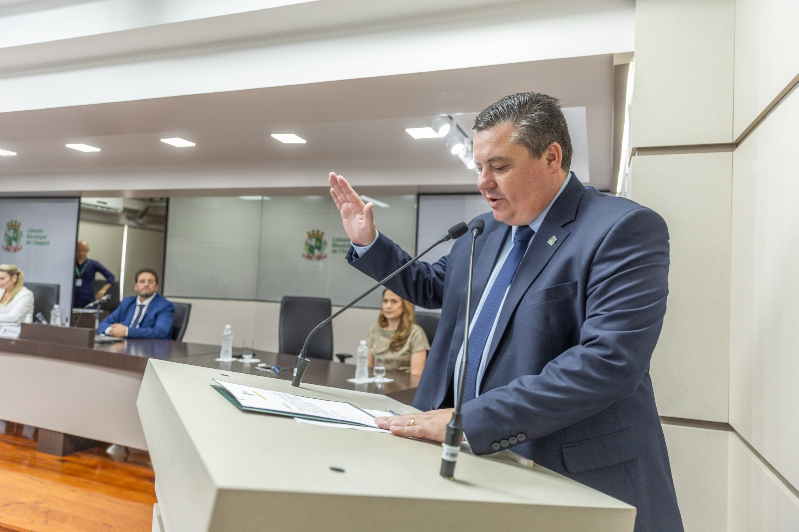 A mudança no comando foi formalizada em sessão solene na Câmara, com leitura do termo de posse e assinatura do compromisso legal. O ato consolidou juridicamente a transferência definitiva da chefia do Executivo.