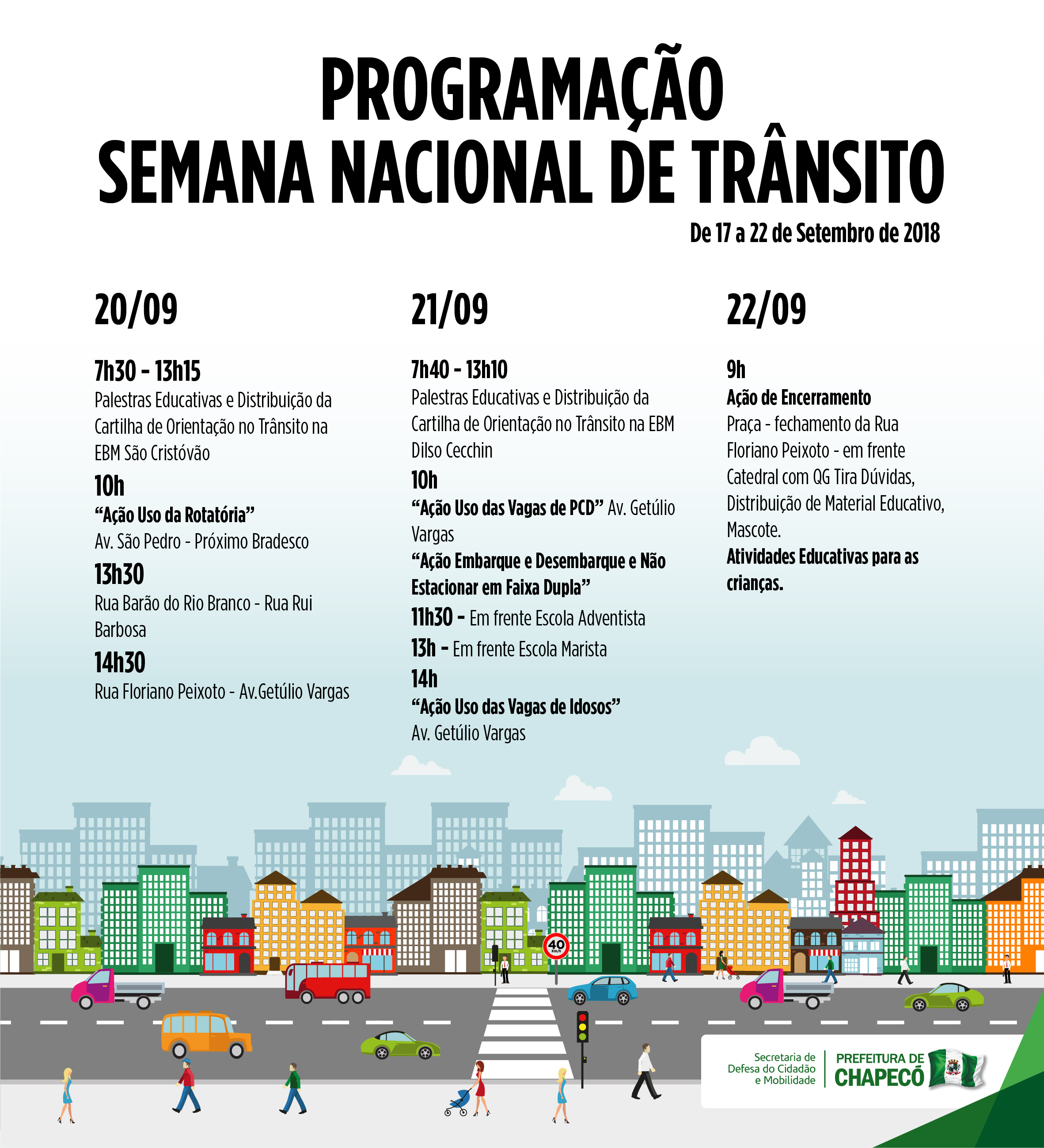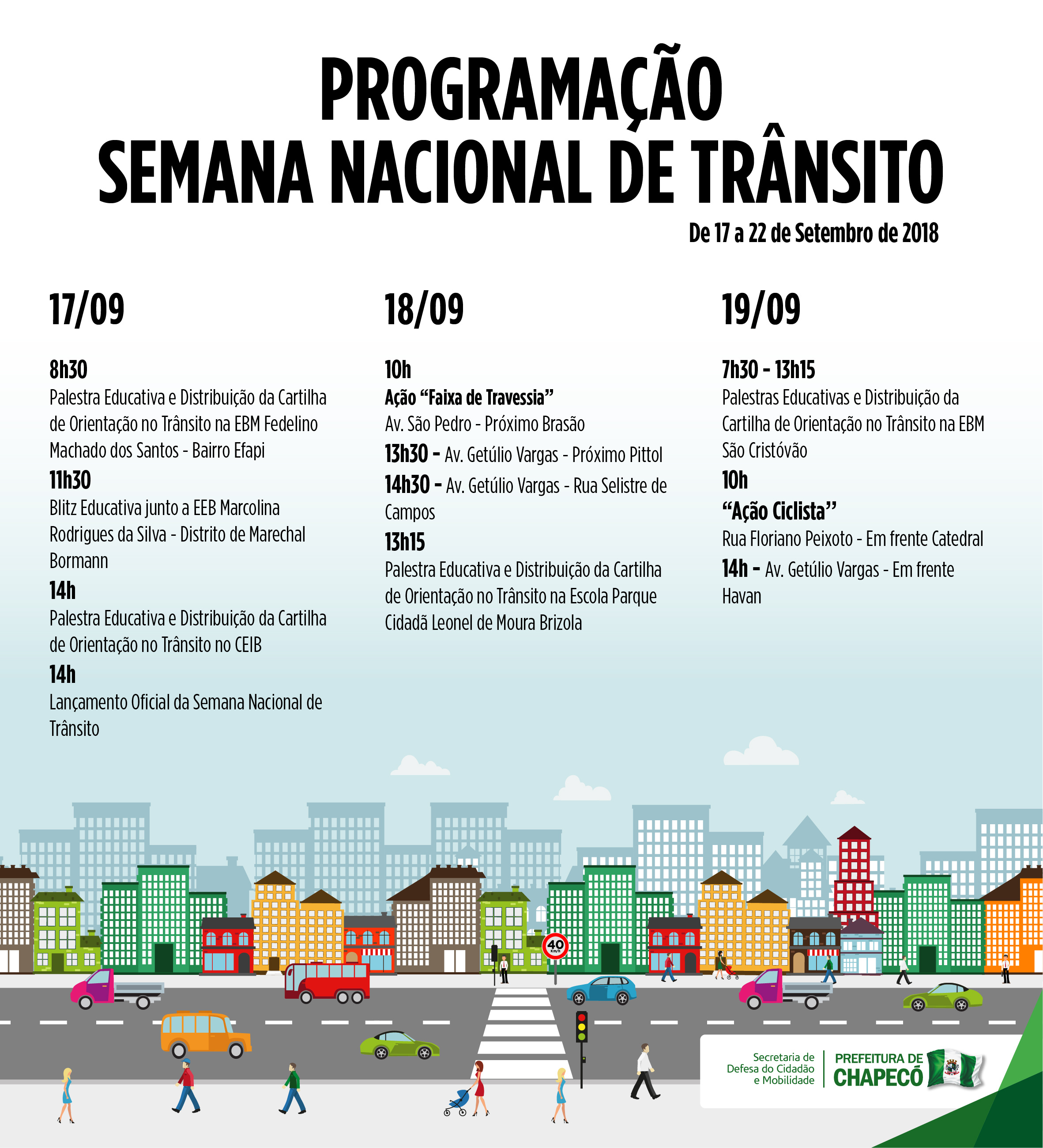 A Administração Municipal, por meio da Secretaria de Defesa do Cidadão e Mobilidade, realiza nesta segunda-feira (17) o lançamento da Semana Nacional do Trânsito em Chapecó que será realizada de 17 a 22 de setembro. Neste anos as ações serão voltadas para conscientização e orientação dos pedestres, motoristas e ciclistas que compõe o trânsito. Entre as ações que serão realizadas, estão as palestras em unidades de ensino, blitz educativas voltadas para o uso adequado de rotatórias, vagas especiais, embarque e desembarque de escolares e entrega de cartilha do trânsito.