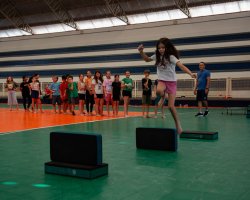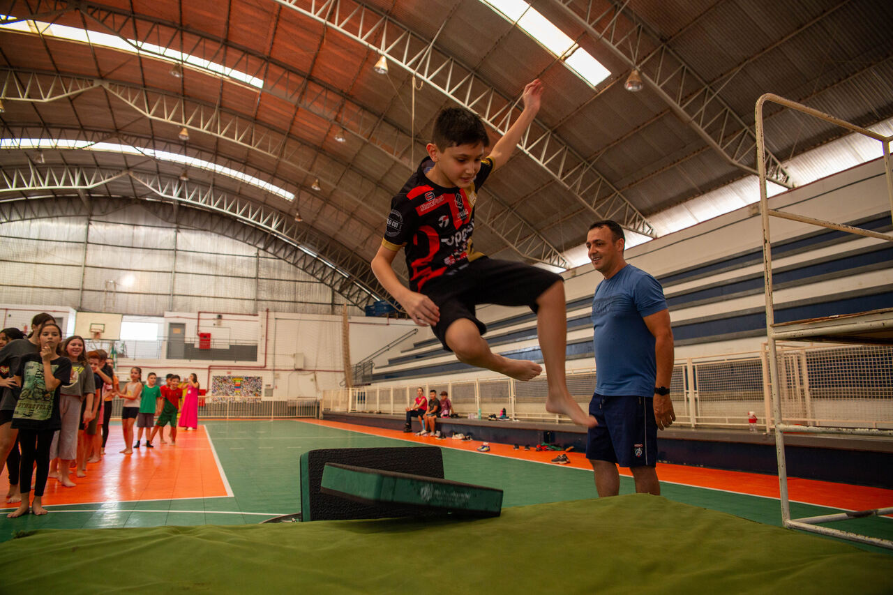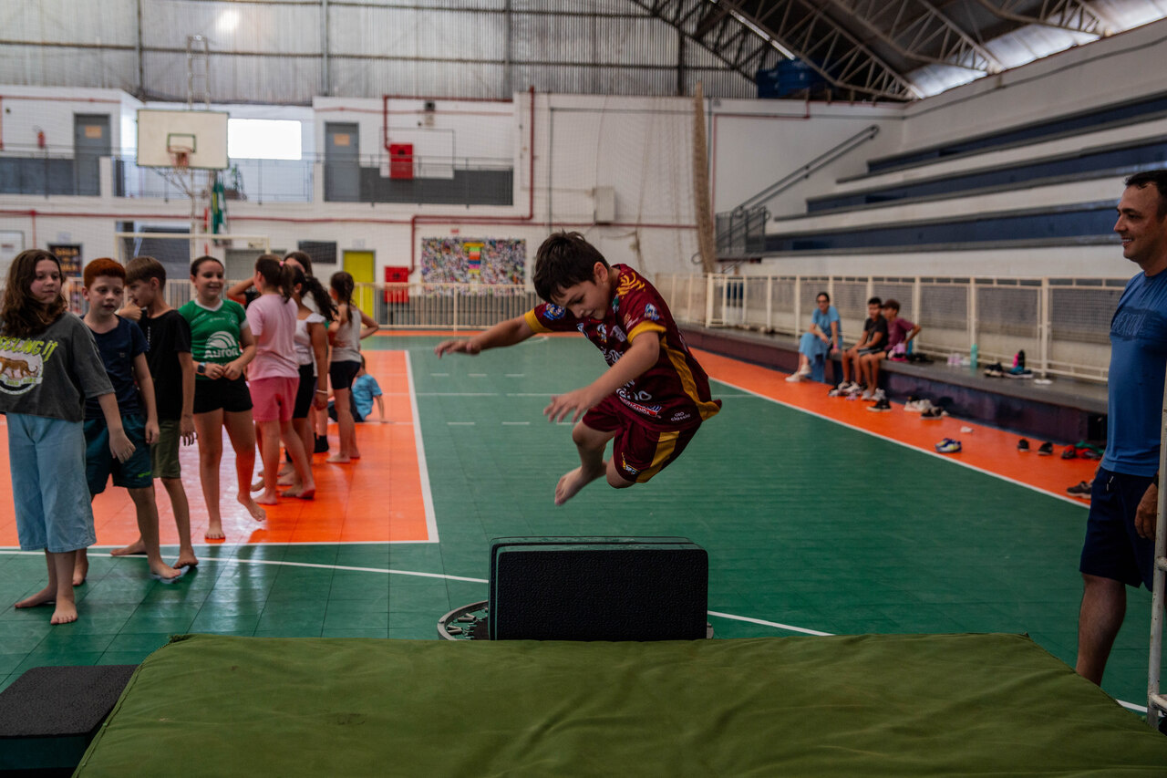 Davi Lucas de Mello, estudante do quinto ano, reconhece a importância dessas atividades para o desempenho esportivo. Nós estamos aprendendo sobre os jogos nas aulas de Educação Física, e em alguns deles a gente precisa saltar, como o handebol. O professor está ensinando os saltos pra gente. Eu aprendi que quando vou dar um salto cambalhota, preciso de velocidade para pular sem parar, conta.