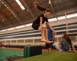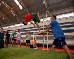 A aluna Heloísa Balhardin Lucca contribui para a fala do colega, destacando o aprendizado e a superação de desafios. Também estamos aprendendo a fazer o salto em queda. Eu aprendi que antes de saltar, eu tenho que me preparar e saber qual salto eu quero fazer, um salto em cambalhota ou um normal. No começo a gente tem medo, mas é muito legal, relata.