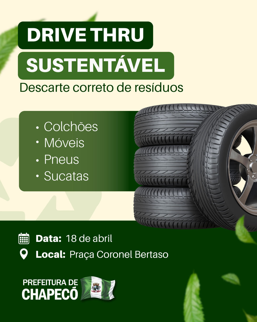 No sábado (18) acontece em Chapecó mais uma edição de uma ação de educação ambiental, o Drive Thru Sustentável - Cidade Limpa, um espaço coletivo para coleta e destino correto de resíduos recicláveis. As equipes estarão coletando materiais como eletrônicos, óleo de cozinha usado, tampinhas plásticas, lacres de alumínio, baterias, vidros, pneus e materiais recicláveis em geral. O evento será na Praça Coronel Bertaso, das 09h às 15h.