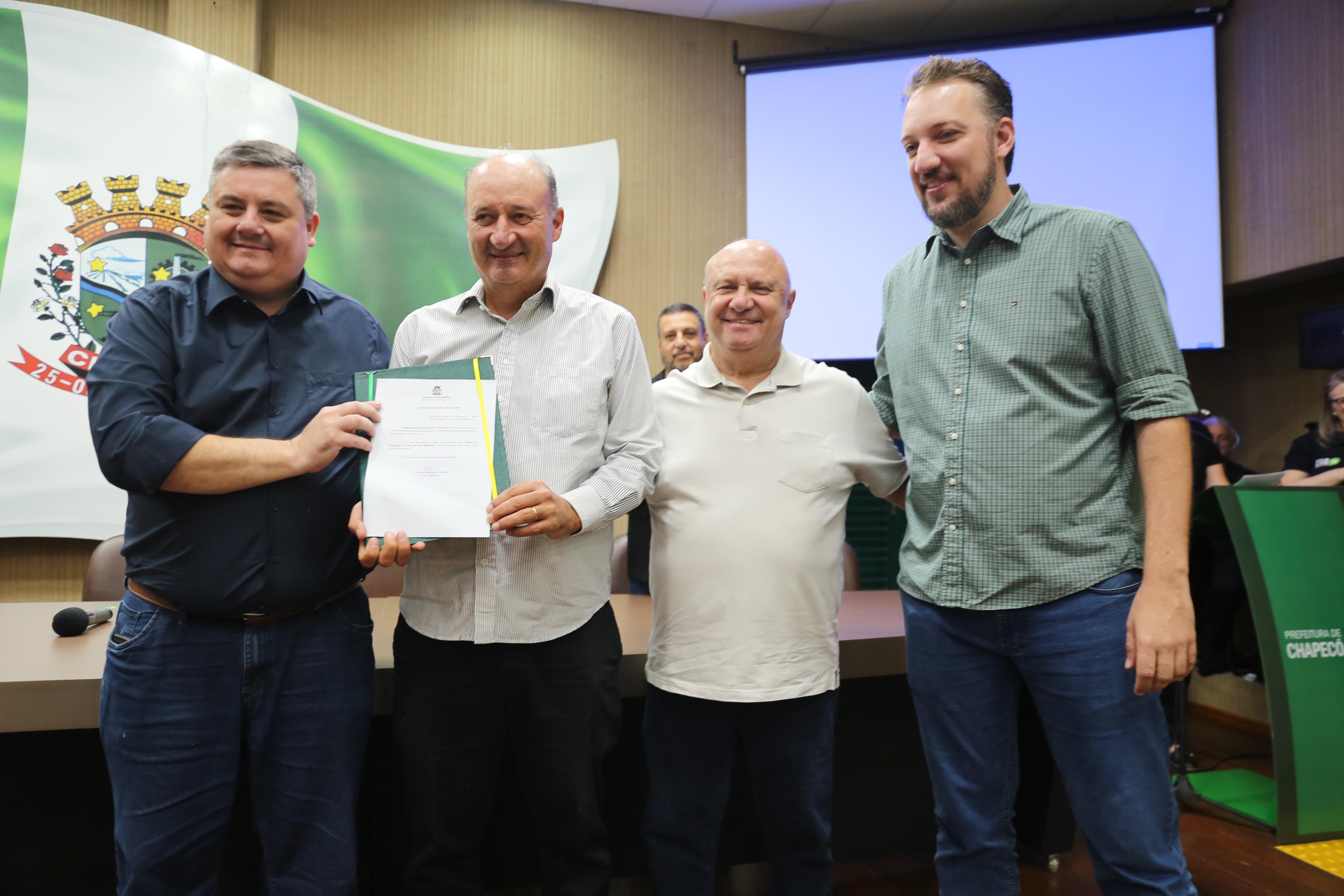 Arthur Badalotti, neto do homenageado, falou em nome dos familiares, agradecendo a homenagem ao presidente do primeiro título estadual da Chapecoense, em 1977. Agradecemos à Administração Municipal pelo reconhecimento ao meu avô, que teve uma trajetória vitoriosa no clube, dano início às conquistas que transformaram a Chapecoense numa potência esportiva, afirmou Arthur.