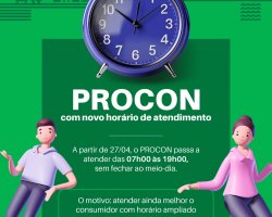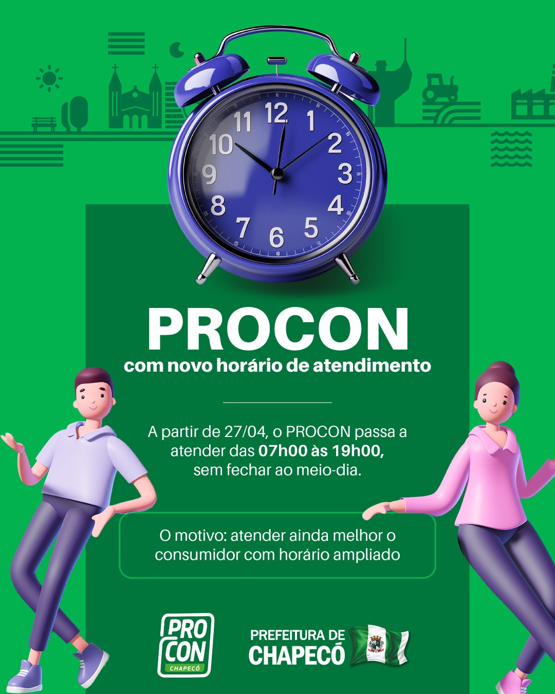 A partir de segunda-feira (27) o Procon de Chapecó ampliará o atendimento ao público, de 8h para 12h. O horário, que anteriormente era das 8h às 11h45 e das 13h15 às 17h30, passará a ser das 7h às 19h, sem fechar ao meio dia.