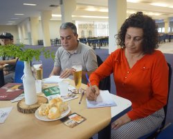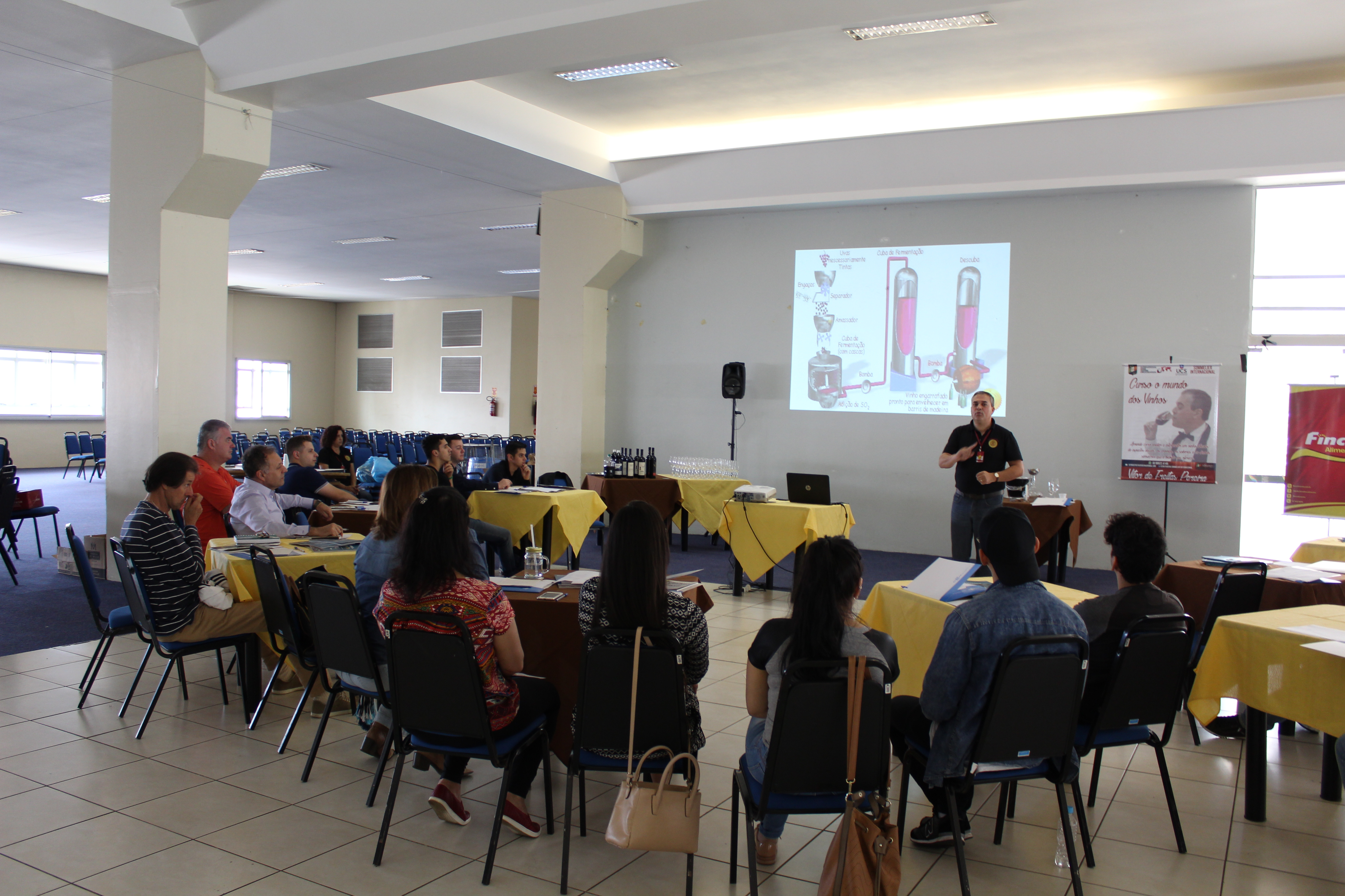 Nesta semana mais um curso voltado aos garçons e profissionais que trabalham em restaurantes, bares e hotéis, marcou o fim do ciclo de capacitações do Projeto em 2018. Com cerca de 50 participantes, o tema abordado pelo sommelier Victor Ferreira foram os vinhos e harmonizações. De acordo com a turismóloga Daniele Jannuzzi, o objetivo do Projeto é levar ferramentas que melhorem o desempenho de cada um dos profissionais que atuam no turismo em Chapecó. O Desbravando Nosso Potencial Turístico atua junto aos estabelecimentos do Município que atendem desde os turistas até a população local, levando desenvolvimento aos profissionais e também as empresas que passam a contar um profissional diferenciado. Por isso, nós buscamos sempre abordar os mais diversos temas que possam contribuir na formação desses profissionais, transformando a sua rotina, propondo mudanças e novas ideias de que maneira que eles se sintam valorizados, explica Daniele.