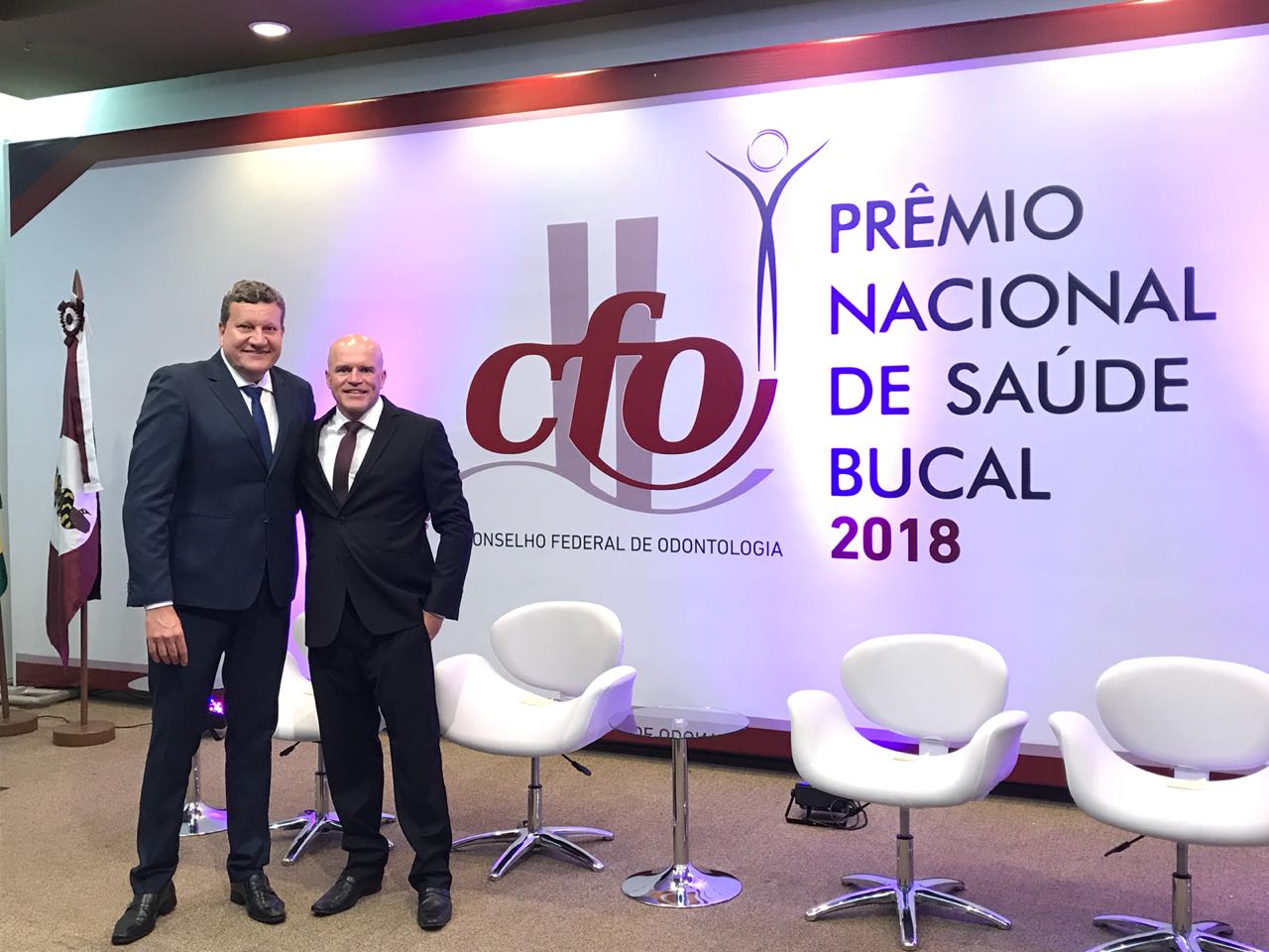 O Prefeito de Chapecó, Luciano Buligon e o Coordenador do Centro de Especialidades Odontológicas, Alex Schaun receberam nesta terça-feira (30/10), em Brasília, o Prêmio Nacional do Conselho Federal de Odontologia (CFO) em Saúde Bucal. A solenidade aconteceu no Hotel Kubitschek Plaza. Em sua manifestação, o Prefeito dedicou o prêmio aos profissionais da saúde do Município. Isso demonstra o excelente trabalho dos nossos profissionais e faz com que tenhamos ainda mais compromisso, zelo e qualidade na gestão dos serviços públicos da saúde em Chapecó, completou.