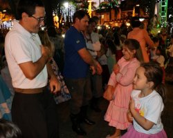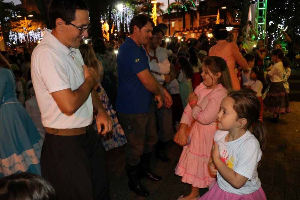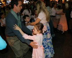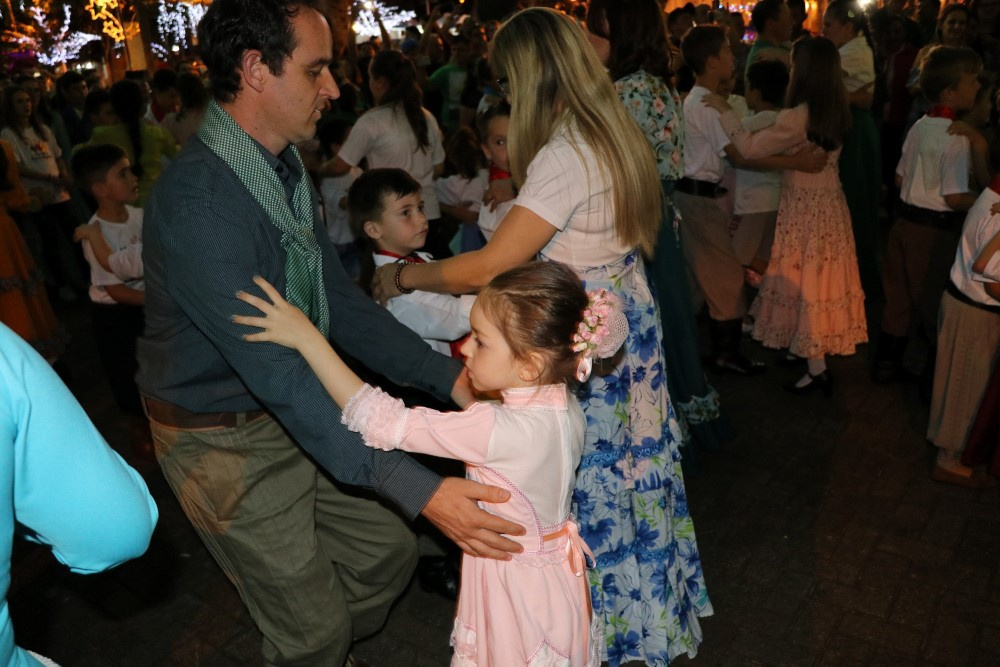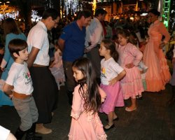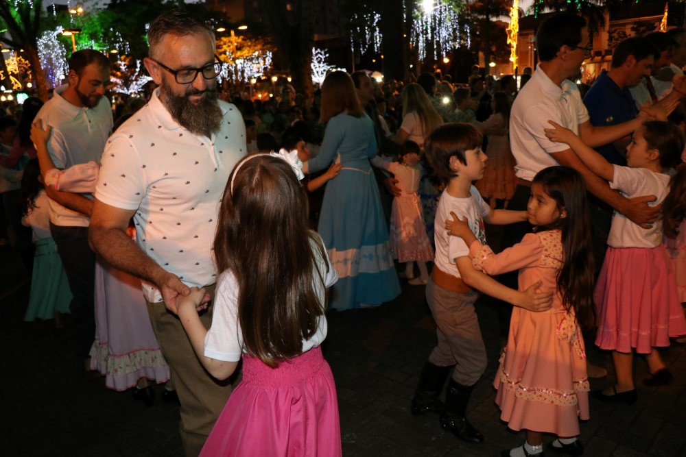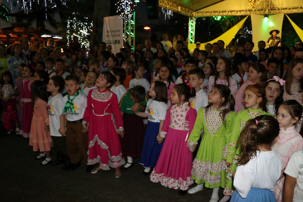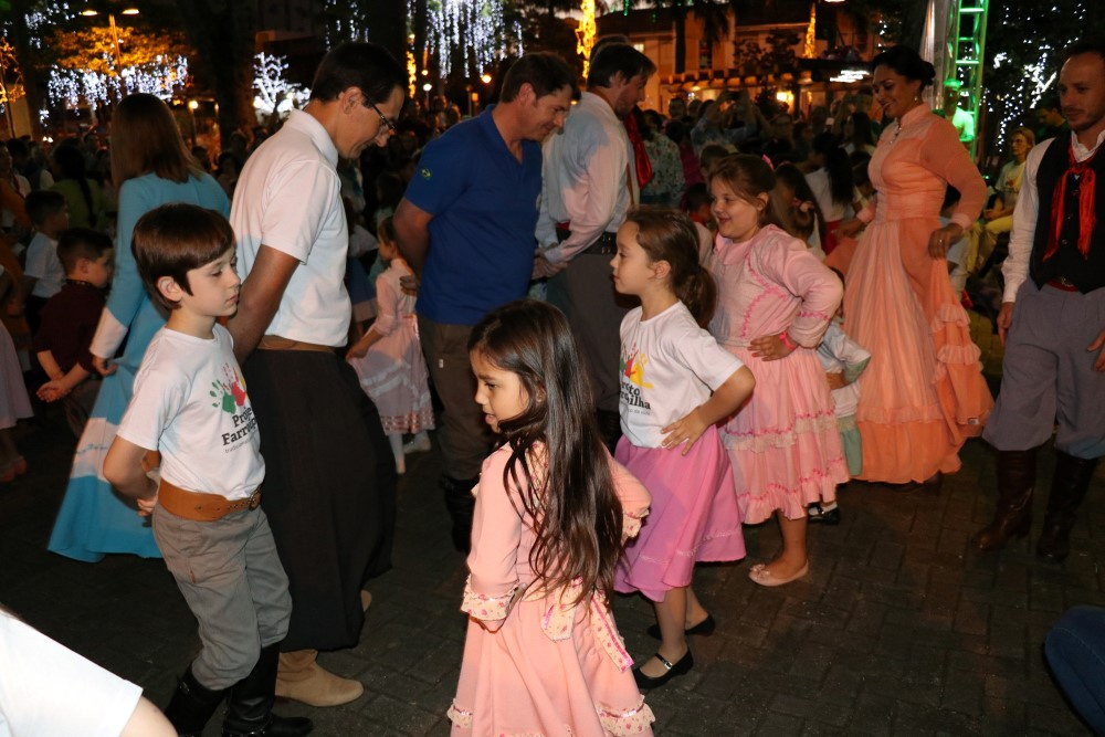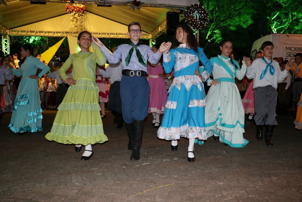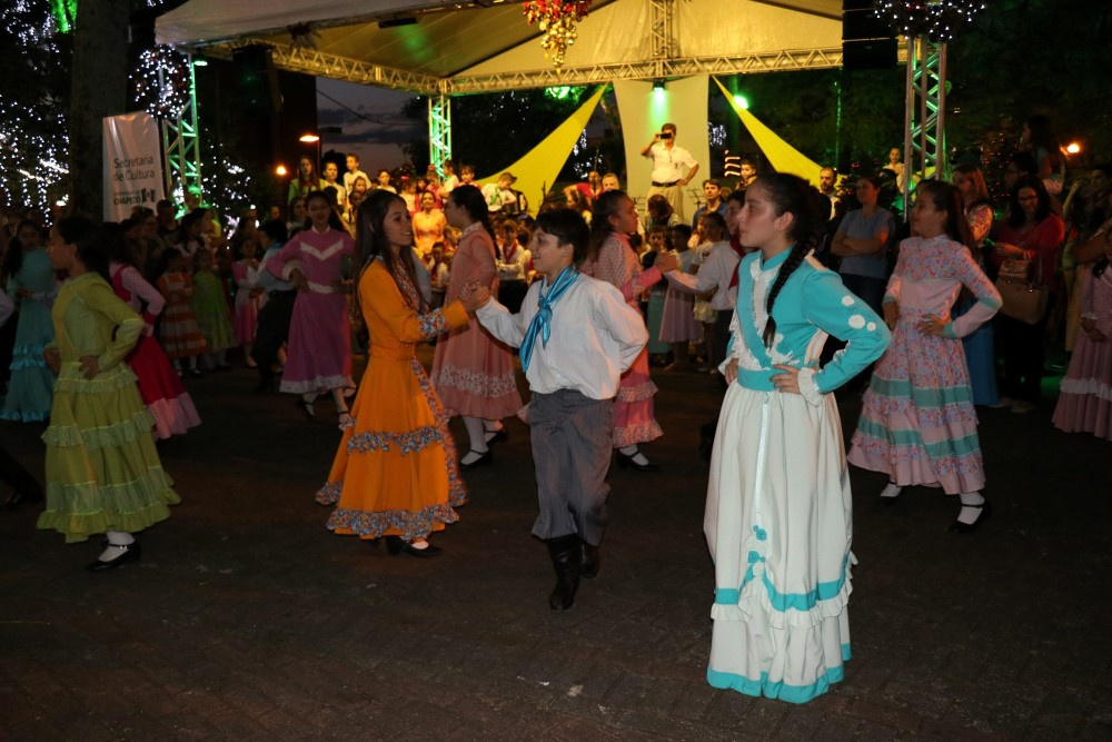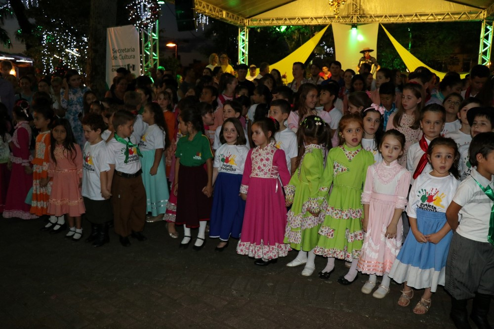 Chapecó, 06/12/2018, quinta-feira O tradicionalismo gaúcho também teve vez no Natal 2018 em Chapecó. Os participantes do Projeto Criança Farroupilha: Tradicionalismo Gaúcho Ampliando Saberes, desenvolvido pela Administração Municipal, por meio da Secretaria de Educação, realizou apresentações artísticas na quarta-feira (05). As crianças e adolescentes do projeto se apresentaram na Praça Coronel Bertaso, juntamente com os familiares, a Dança da Sarna e um grupo apresentou o Chote de Duas Damas e Chimarrita. Para encerrar, todos os participantes do Projeto Criança Farroupilha cantaram a música Aleluia na versão sertaneja do Cantor e Compositor Elton Saldanha.