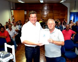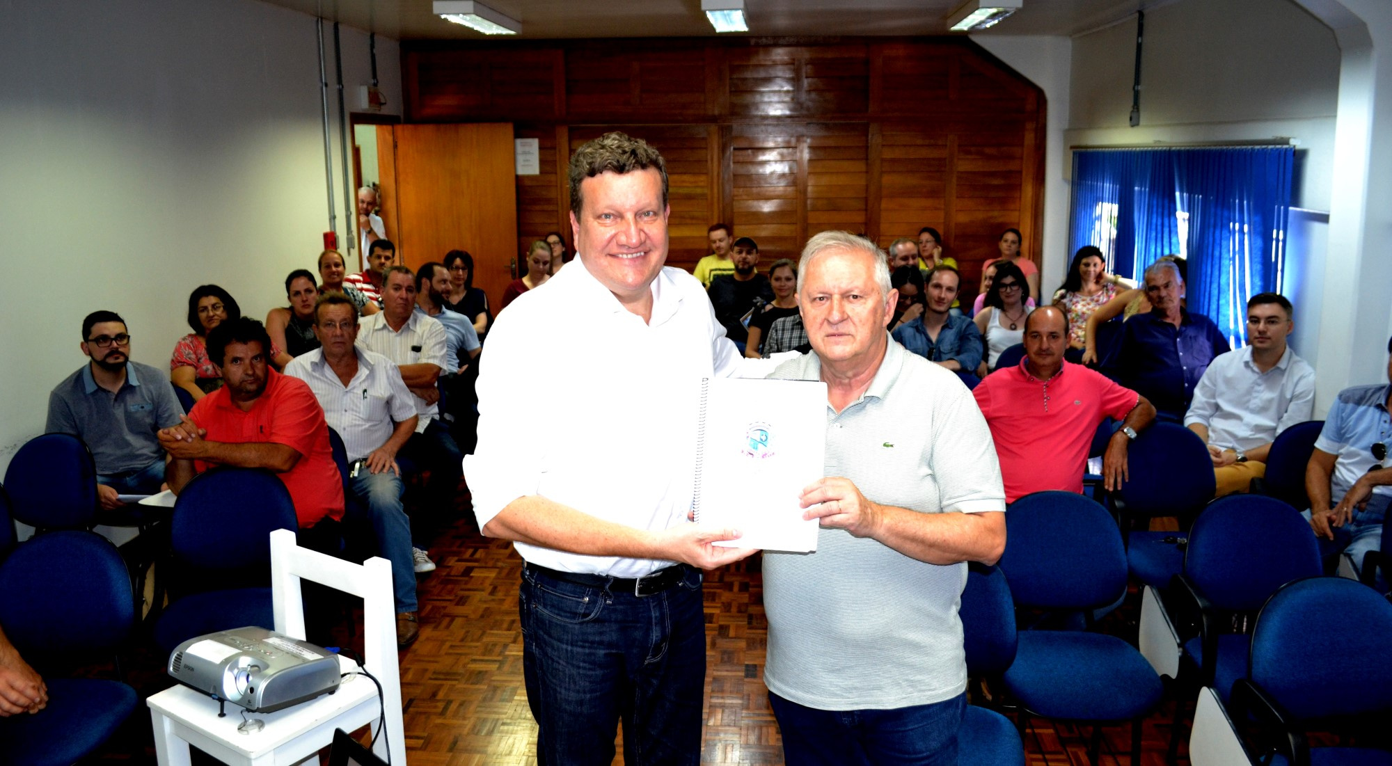 Chapecó, 14 de dezembro de 2018 - sexta-feira - O relatório das ações realizadas em 2018 na área de Desenvolvimento Rural e Meio Ambiente de Chapecó foi apresentado na tarde desta quinta-feira (13/12), no auditório do Mercado Público Regional. Os números foram expostos pelo Secretário da pasta, Valdir Crestani, que fez oficialmente a entrega do relatório anual ao Prefeito, Luciano Buligon.