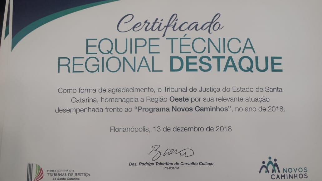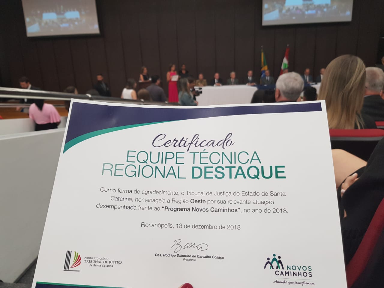 Chapecó, 19/12/2018, quarta-feira - Aluna da 9ª série do Ensino Fundamental, participante do Programa Novos Caminhos (TJ/SC) desde 2017, N.M.S.C., 15 anos de idade, foi uma dos 13 jovens homenageados na categoria regional "adolescente destaque", em ato realizado pela Coordenadoria Estadual da Infância e da Juventude (CEIJ), do Tribunal de Justiça de Santa Catarina (TJSC). N.M.S.C está no Serviço de Acolhimento mantido pela Secretaria de Assistência Social (SEASC) do Município de Chapecó, desde 2013.