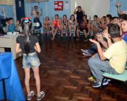 Para o aluno Christian Dos Santos Rade, de 10 anos, a atividade de hoje foi muito produtiva. Conheço a Ana Júlia desde a 1ª série e para nos comunicar com ela agora já é fácil porque já tivemos a oportunidade de aprender Libras. A pessoa ouvinte consegue falar com palavras e o surdo fala com as mãos. Para mim é algo a mais porque aprendendo Libras além de melhorar a comunicação, a gente pode ajudar as outras pessoas.