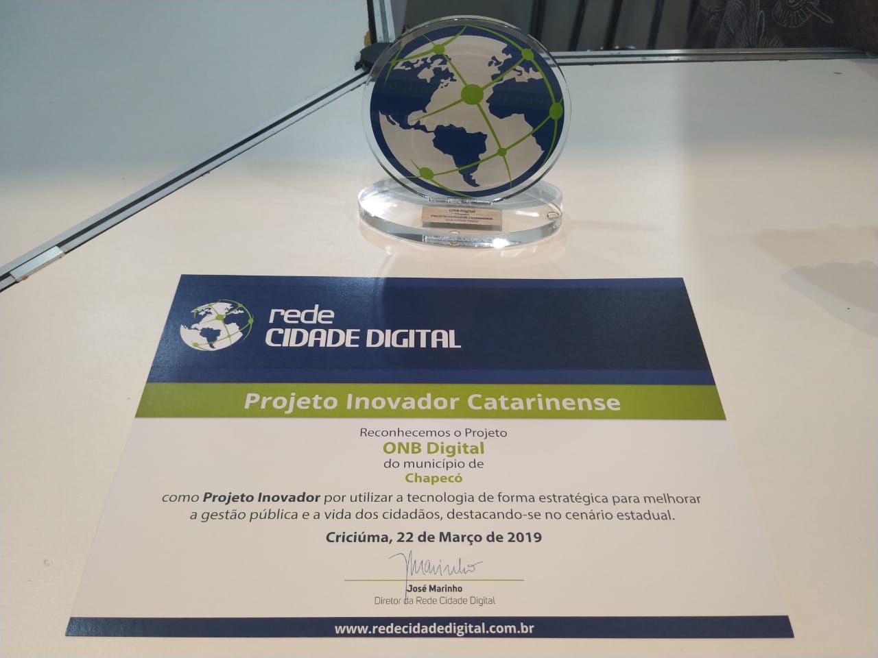 O Ouvindo Nosso Bairro Digital,ferramenta desenvolvida para aproximar o cidadão e o poder público, foi reconhecido nesta sexta-feira (22), como Projeto Inovador de Santa Catarina. A premiação aconteceu durante o 4º Congresso Catarinense de Cidades Digitais, realizado na Associação Empresarial de Criciúma (ACIC) no Sul do Estado. Além de Chapecó, outras três cidades também receberam a premiação. O evento é promovido pela Rede Cidade Digital, iniciativa em parceira com Prefeituras e Associações de Municípios. Além deste, na quinta-feira (21), o Prefeito Luciano Buligon recebeu o título de Prefeito Inovador do Estado pela iniciativa do ONB Digital e Aprova Digital.