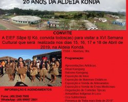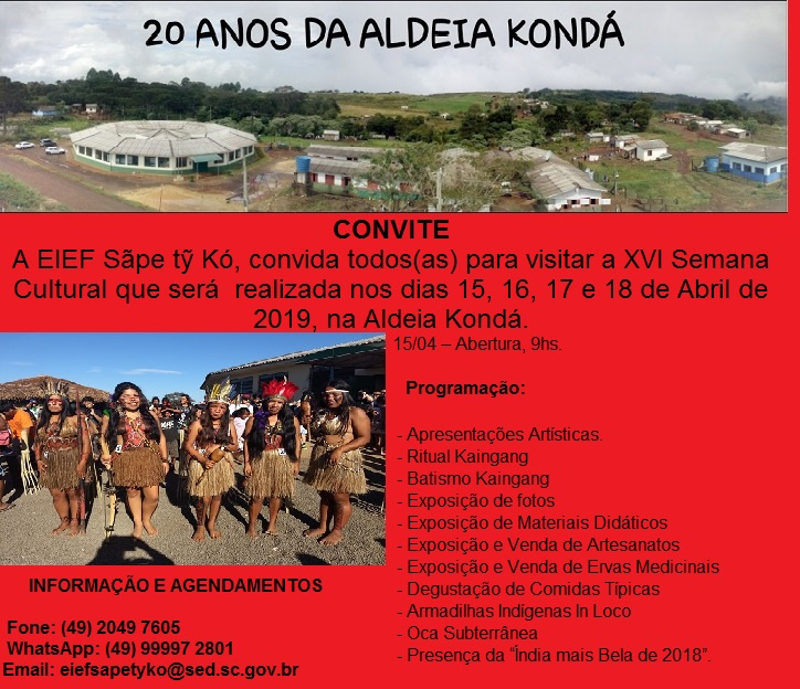 Chapecó, 11/04/2019, quinta-feira Entre os dias 15 e 18 de abril, acontece na Aldeia Condá em Chapecó a XVI Semana Cultura Indígena. Na programação terá apresentações artísticas, Rituais e Batizado Kaigang, exposição de fotos, materiais didáticos, venda de artesanato e ervas medicinais, degustação de comidas típicas, construção de armadilhas, visita a oca subterrânea e visita da Índia Mais Bela de 2018. A abertura oficial, será na segunda-feira (15) às 09 horas.
