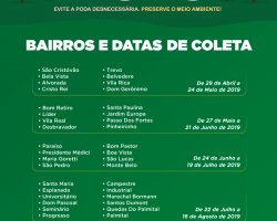 O material de divulgação distribuído pela Prefeitura tem a intenção de orientar o cidadão sobre a necessidade de realizar a poda observando o período de coleta no bairro dele.Precisamos que a população fique atenta aos dias específicos de coleta e realize a poda de acordo com o cronograma estipulado, evitando o acúmulo desnecessário de galhos e a consequente proliferação de insetos, ressaltou Pizzinatto.