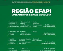 A Prefeitura de Chapecó, por meio da Secretaria de Infraestrutura Urbana e da Superintendência da Efapi, inicia no dia 29 de abril o trabalho de coleta de galhos na área urbana. O cronograma com as datas específicas para cada região da cidade está sendo distribuído nos Bairros e Loteamentos, e também está à disposição em Centros de Saúde da Família (CSF) e Centros de Referência da Assistência Social (CRAS). O flyer com o período de coleta em cada bairro também pode ser acessado no site do Município e nas redes sociais oficiais da Prefeitura (cronograma em anexo).