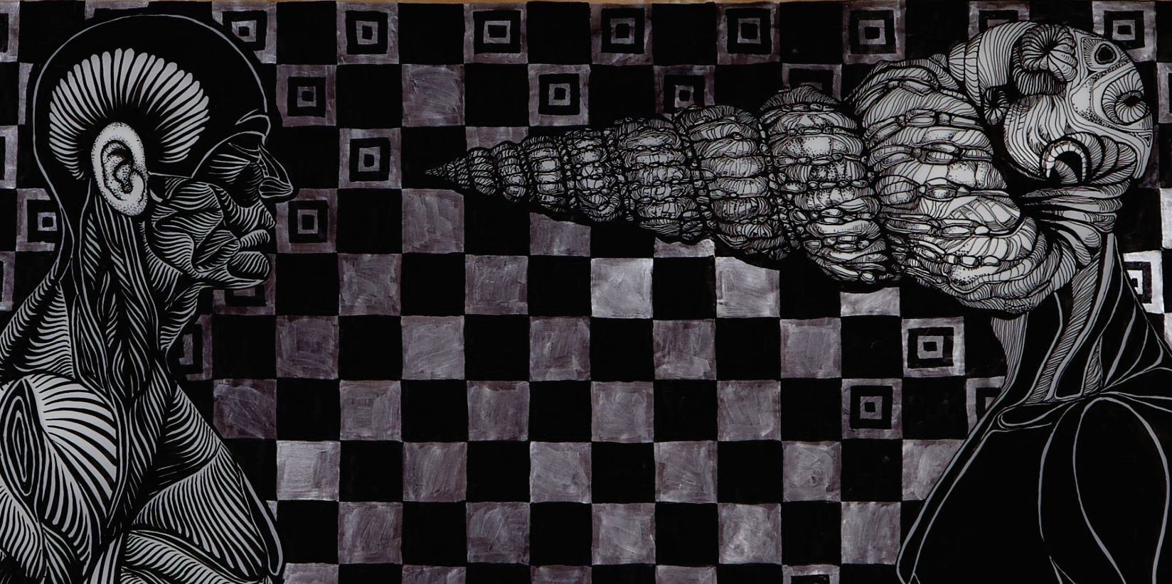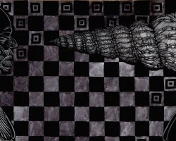 A série de 25 desenhos que compõem Anatomias Hibridas: Inventando Eus (nanquim sobre papel vegetal) apresenta figuras antropomórficas imersas na saturação de elementos ornamentais que funcionam como enquadramento delimitando seu alcance por meio de estampas ou elementos decorativos, simulando molduras com o uso do nanquim sobre o papel vegetal. Inventar eus possíveis reflete, portanto, o caráter auto referencial: do eu artista, eu docente, eu sujeito, assim como os infinitos eus que habitam e atravessam a produção artística diversificada e inventiva.