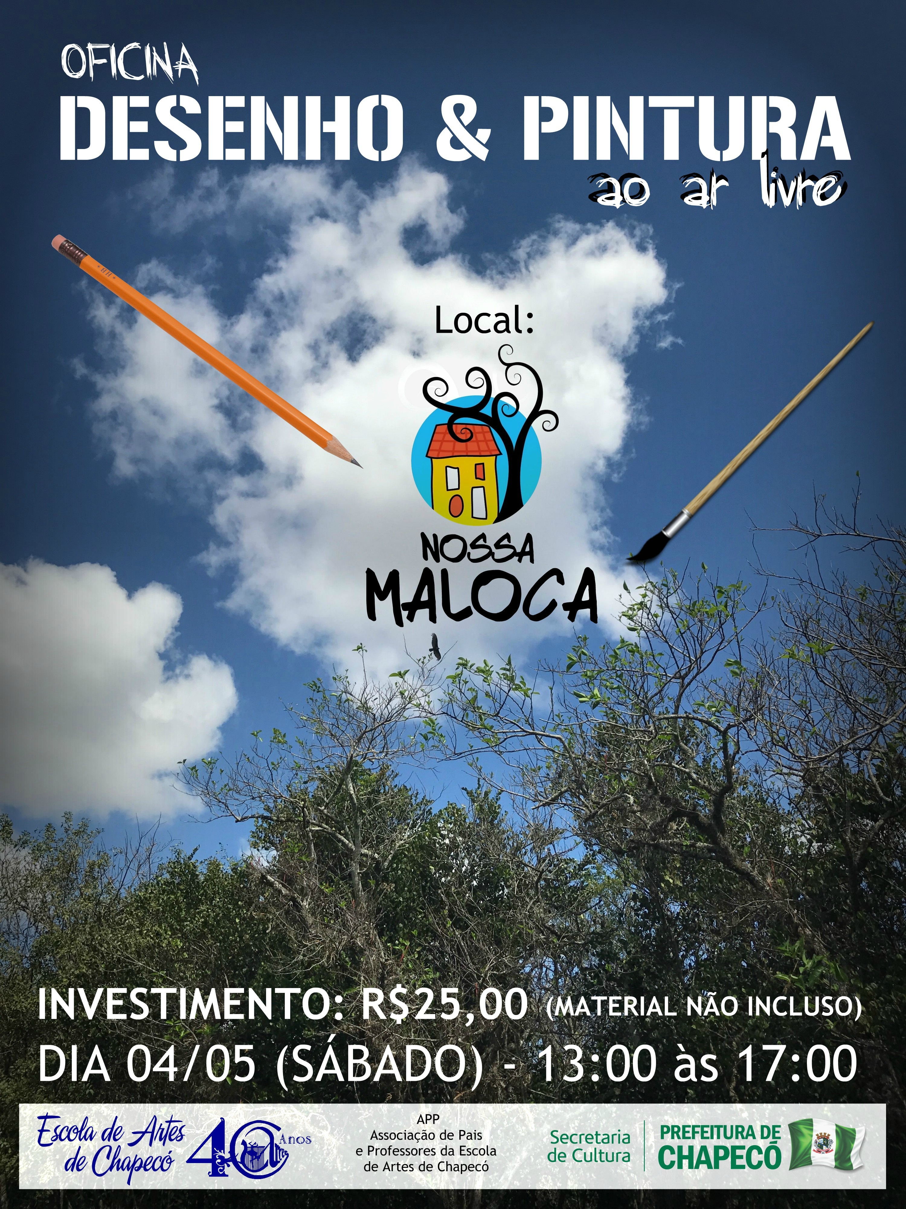 Chapecó, 25/04/2019, quinta-feira Que tal passar uma tarde de sábado diferente, desenhando e pintando e em contato com a natureza? A oficina DESENHO E PINTURA AO AR LIVRE foi pensada pelos professores dos cursos de Desenho e Pintura da Escola de Artes de Chapecó, a fim de oportunizar aos interessados nestas linguagens o conhecimento e/ou aperfeiçoamento de técnicas de desenho e pintura rápida, croquis e esboços, capturando a essência do espaço, através da observação direta da natureza e do meio ambiente.